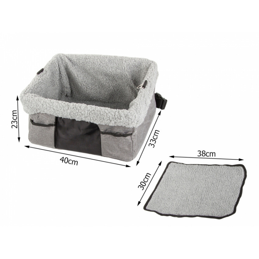 Vyrobeno z kvalitních materiálů, má vnitřek vystlaný měkkou kožešinou, kde se váš miláček bude cítit příjemně a bezpečně. Nosič má na bocích dvě velké kapsy zapínané na suchý zip, schováte do nich doplňky vašeho psíka. Má také dvě další menší kapsy na přední straně. Jednoduchá instalace pro rychlou a efektivní instalaci do auta. Má popruh na přenášení nosiče a vnitřní háček na vodítko pro větší bezpečnost.