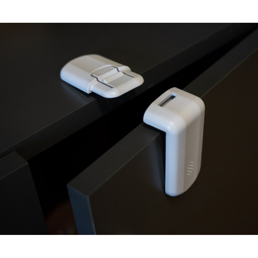 chrání nejen malé prsty před náhodným přiskřípnutím. Je to také ideální způsob, jak zabránit otvírání nábytku s předměty, které jsou pro dítě nebezpečné - například zásuvky s noži. Spona se neotevře bez správného stlačení, čímž zůstane obsah skříňky / zásuvky v bezpečí. Pevná a odolná oboustranná páska velmi dobře drží na povrchu, díky čemuž se blokáda při přetržení nestrhává.