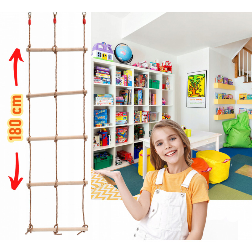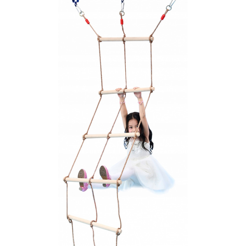 Lanový žebřík na cvičení a zábavu se ideálně hodí do tělocvičny, dětského pokoje nebo na hřiště, či do zahrady. Žebřík je vyroben z dřevěných příček a odolných, pevných lan s kovovými úchytkami.
