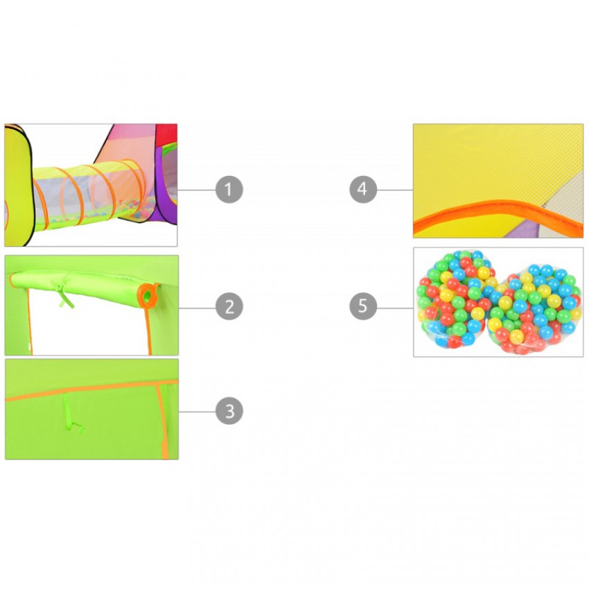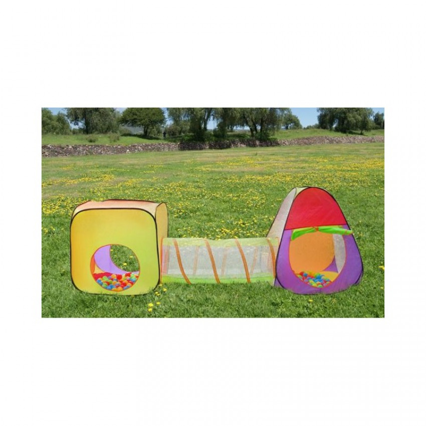 Tento velký dětský stan s 200 kuličkami a plazícím tunelem poskytne Vašim dětem skvělou zábavu. Trojdílný dětský stan můžete postavit doma i venku. S jednotlivými díly je také možné hrát si samostatně. Díly jsou uloženy v praktickém obalu a lze je kdekoliv několika jednoduchými pohyby složit. Otvory zajišťují dobrou cirkulaci vzduchu a díky průhlednému povrchu budete mít své ratolesti při hře vždy pod dohledem.