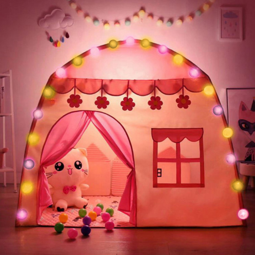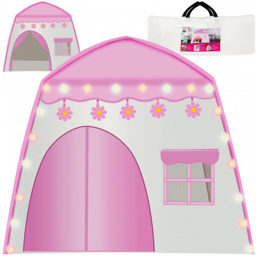 Díky lehkému plastovému rámu ho můžete přemisťovat z místa na místo bez toho, abyste ho museli skládat. Montáž stanu nebude dělat žádné problémy, konec konců, každá malá princezna musí mít své vlastní království. Sada obsahuje praktickou tašku, která usnadňuje skladování a přepravu stanu. Součástí stanu jsou také světýlka, která jsou napájena 2 x AA bateriemi (nejsou součástí), to umožňuje jejich použití venku i uvnitř stanu, protože nemusíte hledat místo s elektřinou. Barva svítidel je růžová a bílá. Celok se skládá z 20 lamp. Lano s lampami je dlouhé 2,8 m.