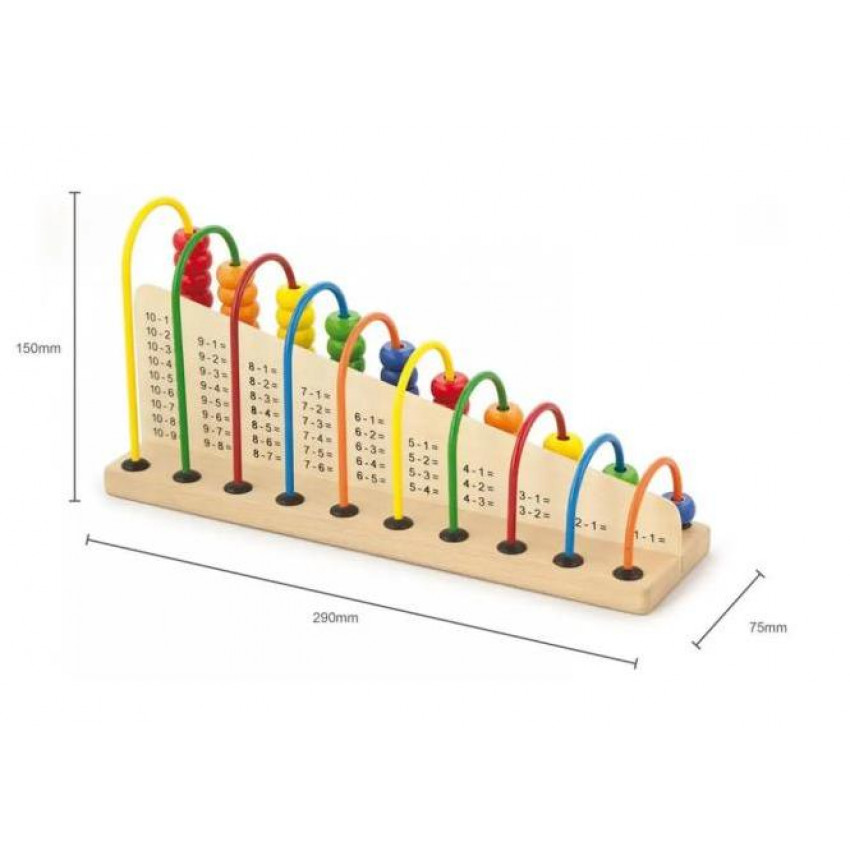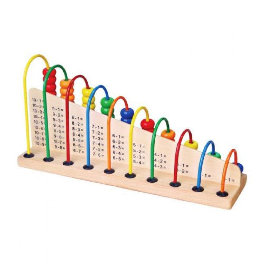 Barevné oboustranné dřevěné počítadlo s dřevěnými kuličkami má uprostřed desku s příklady na počítání. Z jedné strany jsou příklady na sčítání, z druhé strany na odčítání, přičemž děti posouvají kuličky tak, aby znázorňovaly správný výsledek. Děti se takto jednoduše a názorně naučí sčítat a odčítat do 20. Tato edukační pomůcka je vhodná pro předškoláky na výuku základů matematiky.
