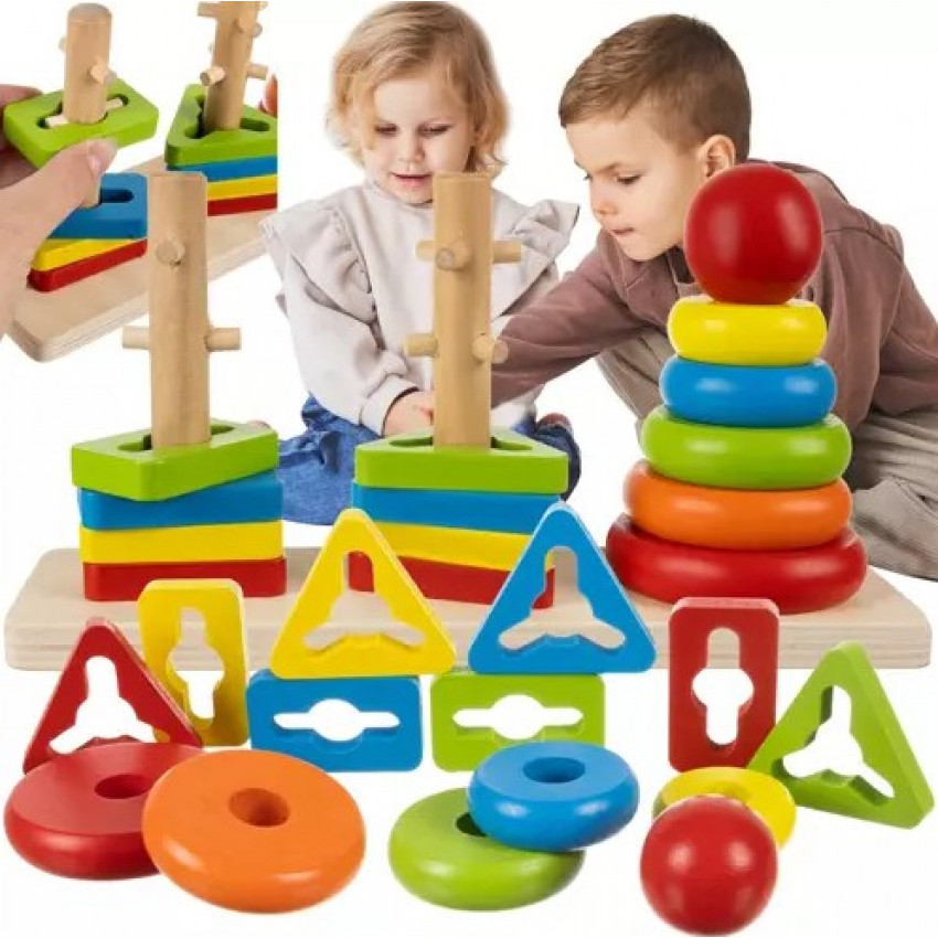 Hra s touto vkládačkou dokonale procvičí ručičky nejmenších a pomáhá při rozvoji jejich motoriky. Nestačí přiřadit kostky k příslušnému otvoru – je třeba s nimi ještě manipulovat, aby prošly přes překážky vyčnívající na kolících. Vkládačka podněcuje představivost a kreativitu. Zábava s kostkami dokonale pomáhá trénovat smysl pro koncentraci a schopnost logicky myslet. Je to skvělý způsob, jak si procvičit trpělivost, koncentraci a paměť. Dřevěné hračky jsou mimořádně trvanlivé a odolné vůči poškození, díky čemuž vydrží roky v perfektním stavu. Je to hračka, která má úspěch, poslouží nejen jednomu dítěti, ale i celým generacím. Vkládačka má 3 tvary: kruh, trojúhelník a obdélník. Tyto základní tvary si dítě zapamatuje už od malička hrou se skladačkou.