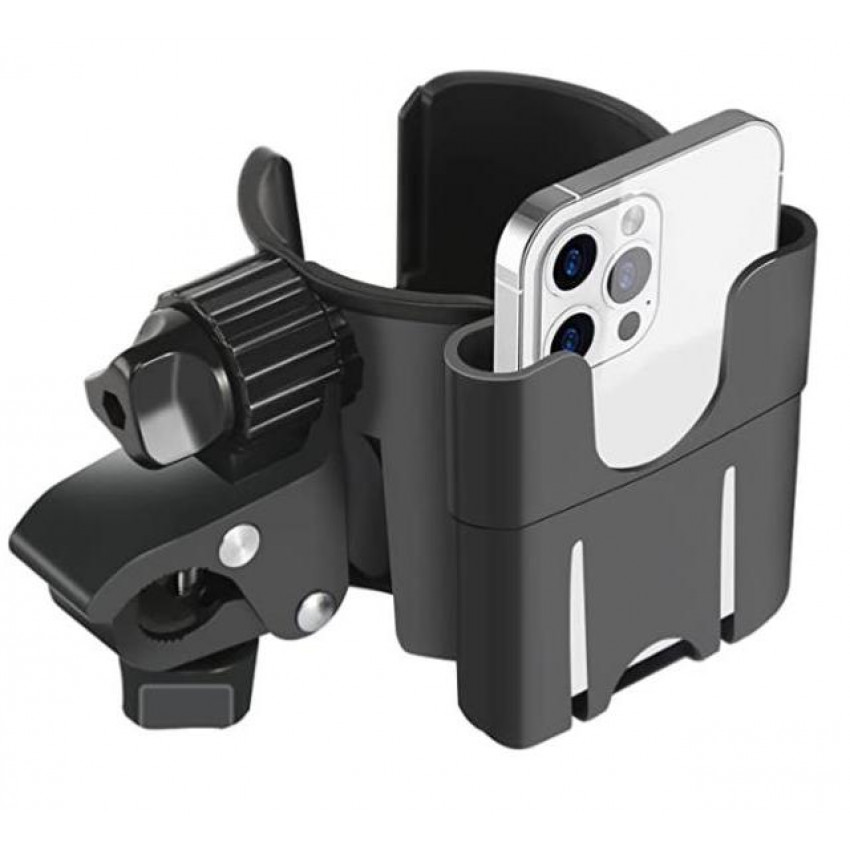 Držák na pohár a telefon k připevnění na kolo, kočárek, invalidní vozík a pod. Díky držáku můžete mít termosku s oblíbeným nápojem a telefon vždy po ruce. Držák se snadno instaluje a pasuje na většinu standardních řídítek na kolo nebo kočárek.