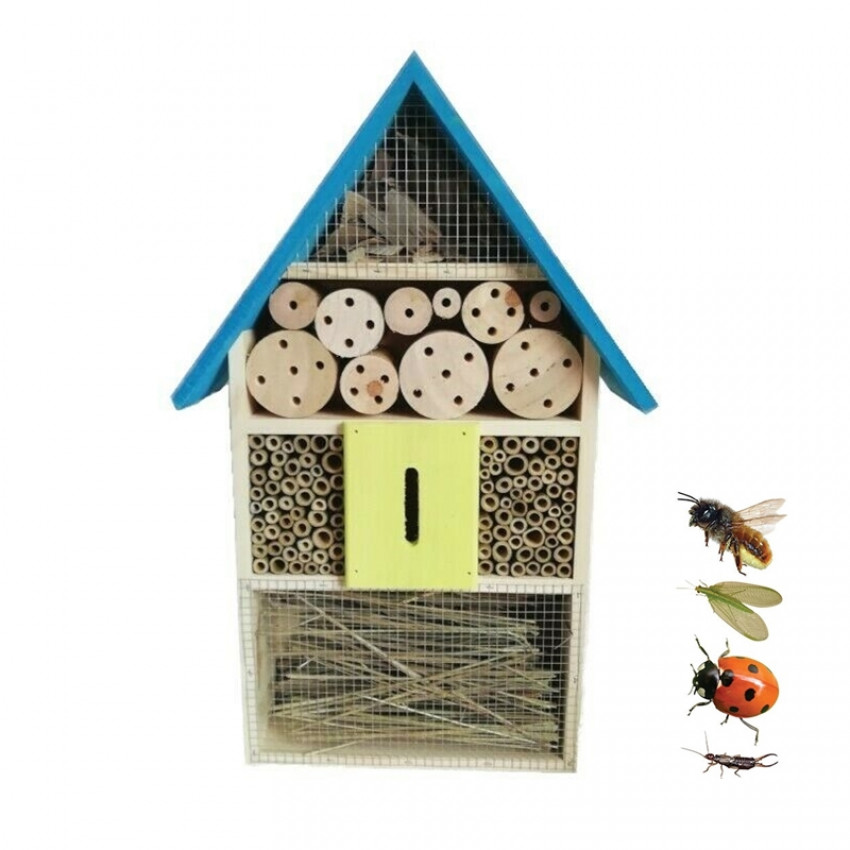 Tento domček, hotel s modrou střechou pro hmyz je ideální jako hnízdiště a zimoviště pro včely a jiný hmyz. Vhodné na zahradu, terasu nebo balkon se suspensí. Domček je impregnovaný vůní lesa, aby přilákal hmyz k ubytování.