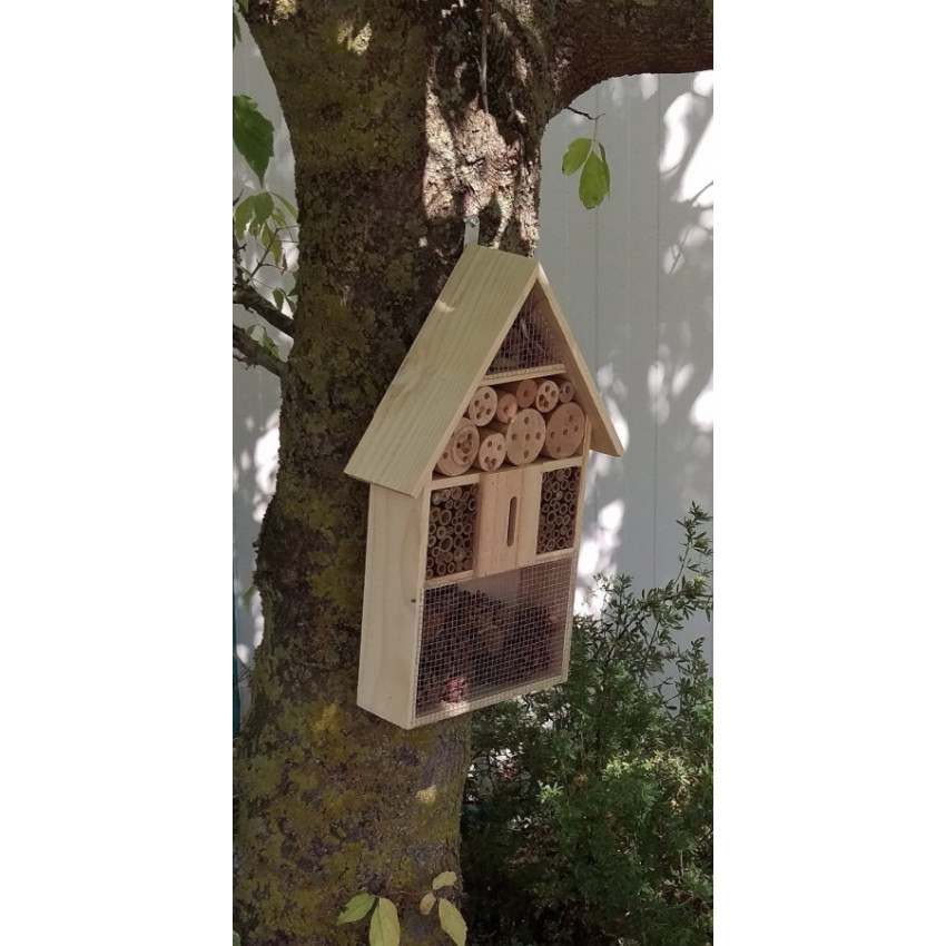 Ideální jako hnízdiště a zimoviště pro včely a jiný hmyz, tento modrý hotel je vhodný na zahradu, terasu nebo balkon. Impregnovaný vůní lesa, přitahuje hmyz k ubytování a pomáhá udržet v zahradě rovnováhu.