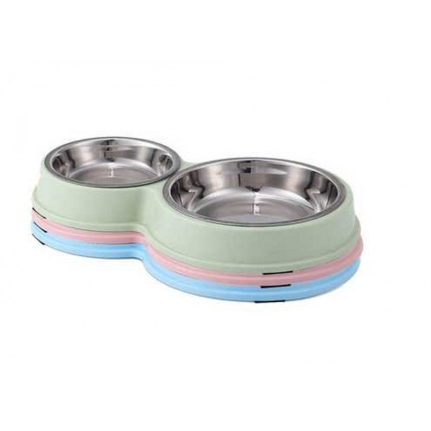 Dvojmiska je z odolného plastu. Je lesklá, pevná a zdravotně nezávadná s příjemným vzhledem. Nerezové misky je možné snadno vyjmout, čímž se zjednodušuje čištění. Miska není určena na přímé ohřev na vařiči, mikrovlnné troubě nebo přímém ohni.