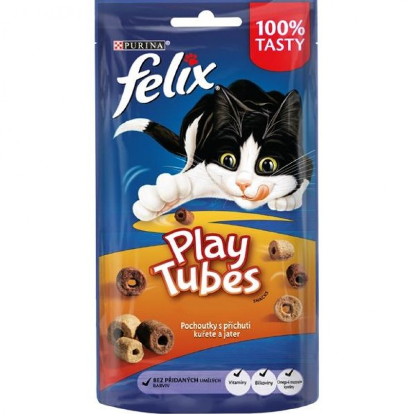 FELIX Play Tubes s příchutí kuřete a játry, hravá a chutná odměna pro vaše kočky. Doplnkové krmivo pro dospělé kočky jako odměna či pamlsek pro potěšení. Nové FELIX ® Play Tubes jsou chutnou příležitostí, jak spolu sdílet zábavné chvíle! Jsou neodolatelně hravé díky unikátnímu kulatému tvaru, dvěma různým příchutím, různým velikostem a chuti FELIX ® pochoutek, které vaše kočka zná a miluje. Jednoduše vezměte pochoutku, hoďte ji nebo kutálete po podlaze a sledujte, jak s ní vaše kočka začne rozkošně vyvádět!