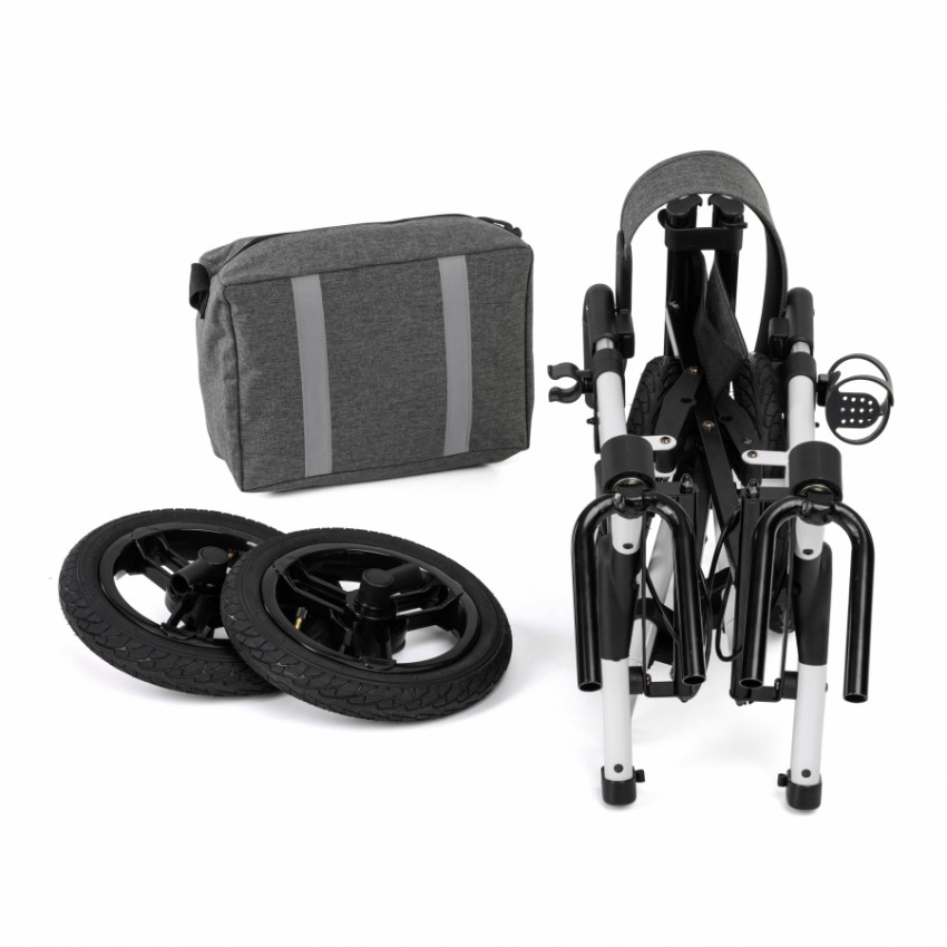 Skládací a vyrobené z hliníkového rámu, toto chodítko je vybaveno velkými nafukovacími koly s průměrem 12'' a výškově nastavitelnými rukojetěmi s anatomickými rukojetěmi.