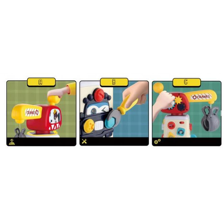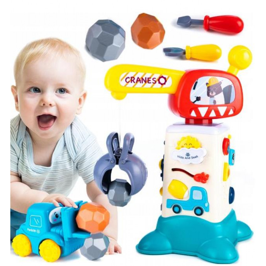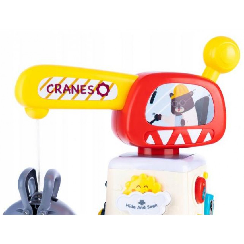 Interaktivní jeřáb s vysokozdvižným vozíkem a imitací balvanů na zvedání. Hračka je vybavena ručním mechanismem na spouštění a zvedání chapadla a otočnou věží. Každá ze stěn má barevné hrací prvky.