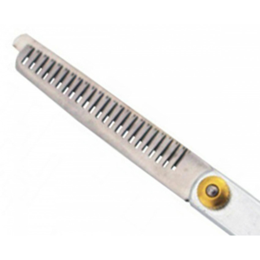 Vyrobené z nerezové oceli, tyto ergonomické ztenčovací nůžky jsou ideální pro profesionální i amatérské stříhání vlasů. Speciální šroub na čepeli umožňuje nastavení vůle, zatímco gumová zarážka mezi úchopy pro prsty zajišťuje tichý chod.
