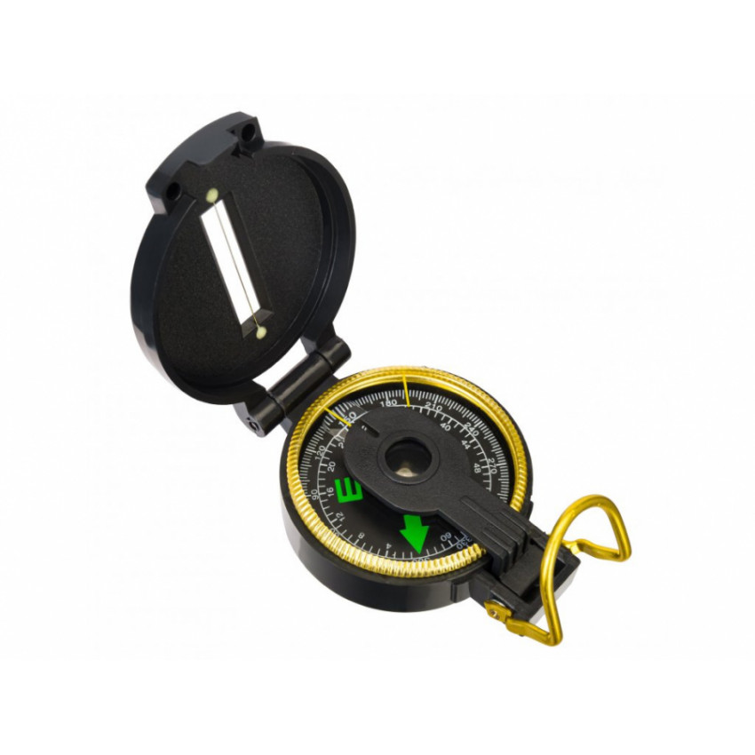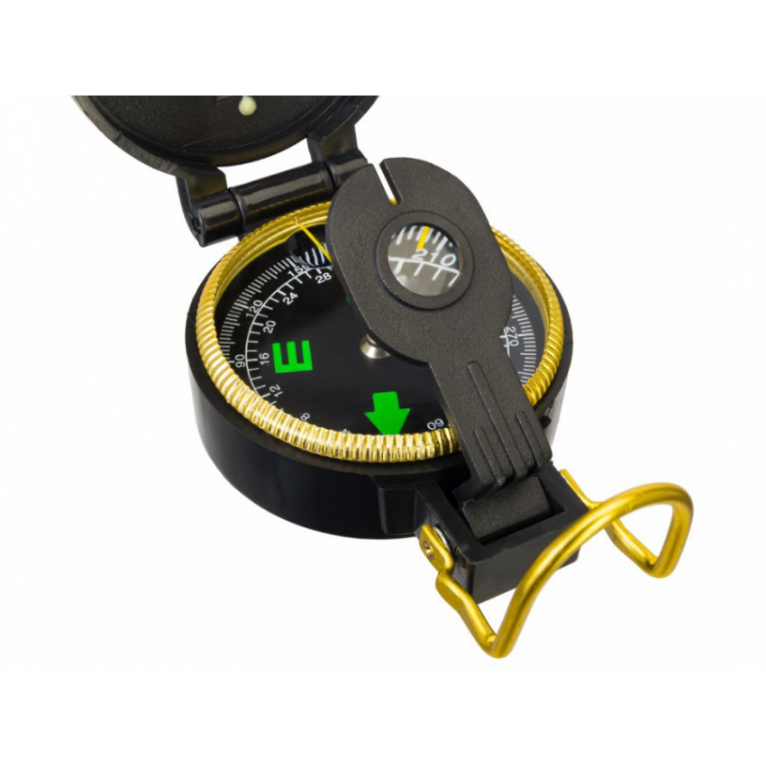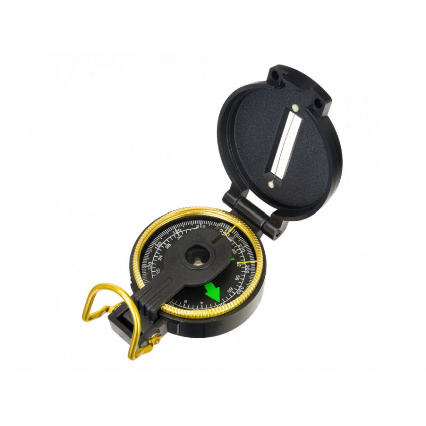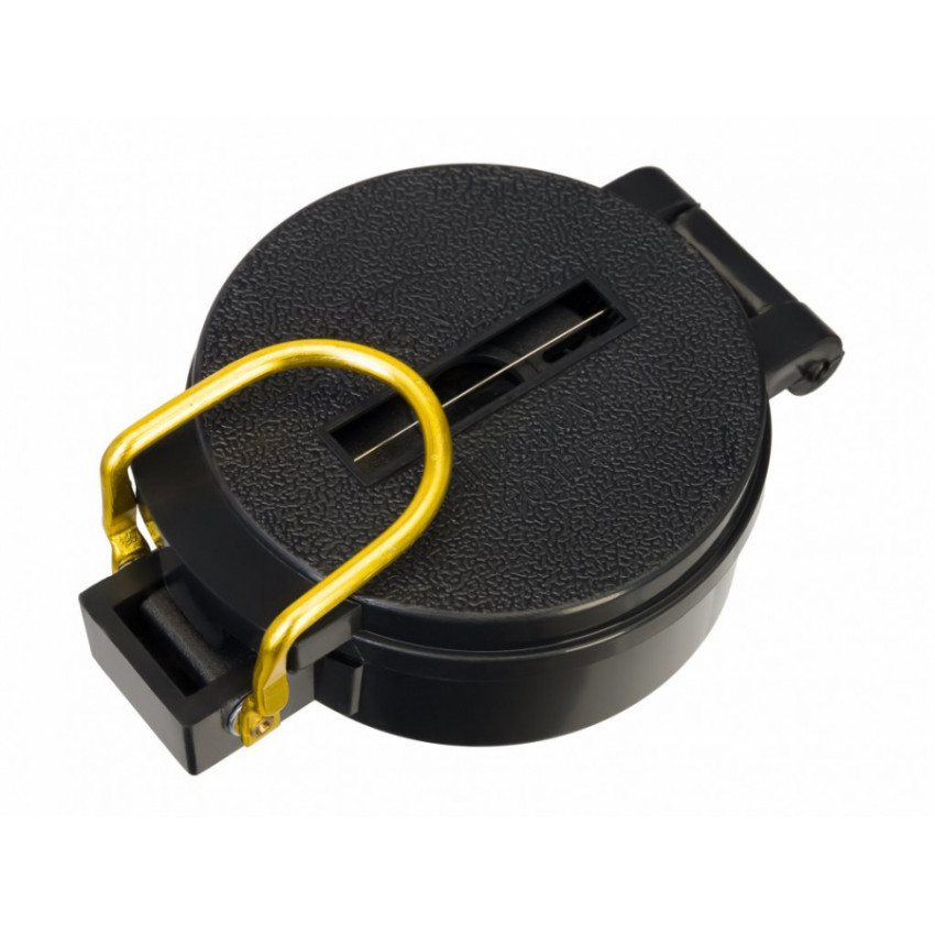 Kvapalinový kompas se střelkou směřující k severu. Skládací design. Doplněný štěrbinou zaměřovače a zaměřovacím drátem. Střelka je uložena v kapalině, lupa na buzole slouží pro lepší odčítání ze stupnice, vlas pro přesnější zaměření bodu.