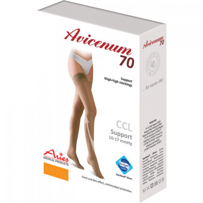 LYCRA® Soft Comfort zajišťuje perfektní elasticitu a kompresivní účinky těchto produktů. Punčochy mají špičkovou úpravu švýcarské firmy Sanitized ® s bakteriostatickým a deodorizačním efektem, abyste se mohli cítit sebevědomě i po celodenním nošení. Tato úprava vydrží na produktech Avicenum po dobu až 120 pracích cyklů. Punčochy neobsahují latex.