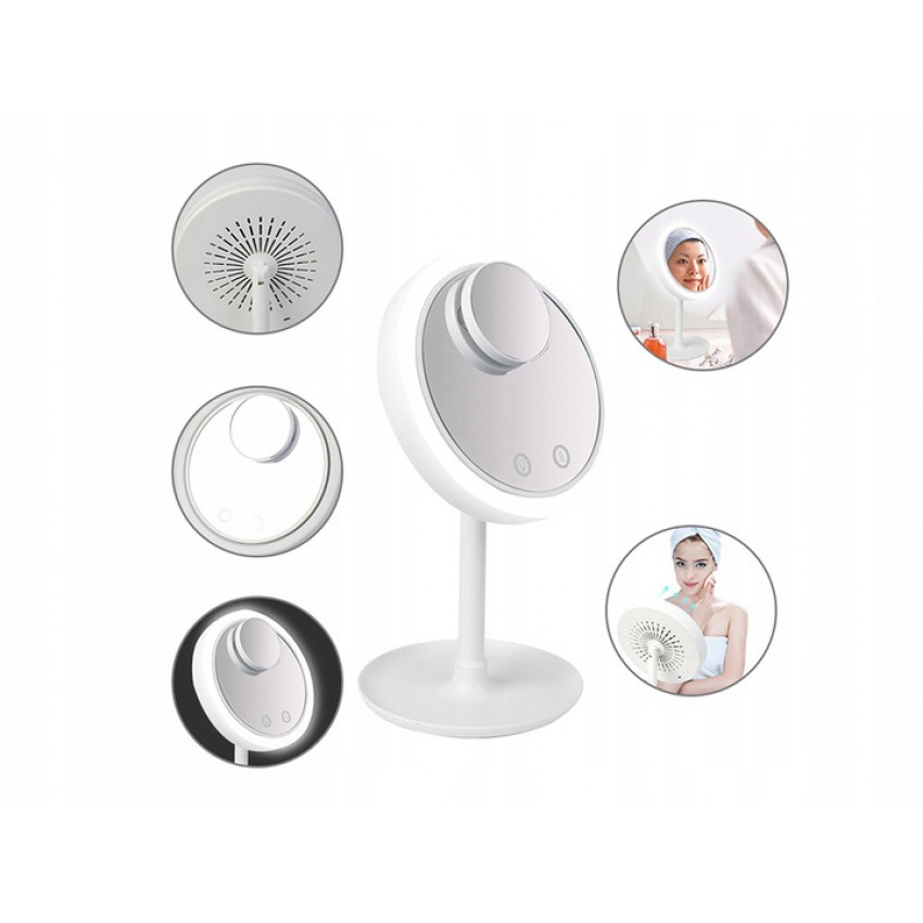 LED podsvícení zajišťuje správnou viditelnost každé části obličeje, krku a dekoltu během líčení. Zrcadlo má dvě zabudovaná tlačítka, jedno pro osvětlení, druhé pro ventilaci se třemi úrovněmi nastavení proudění vzduchu.