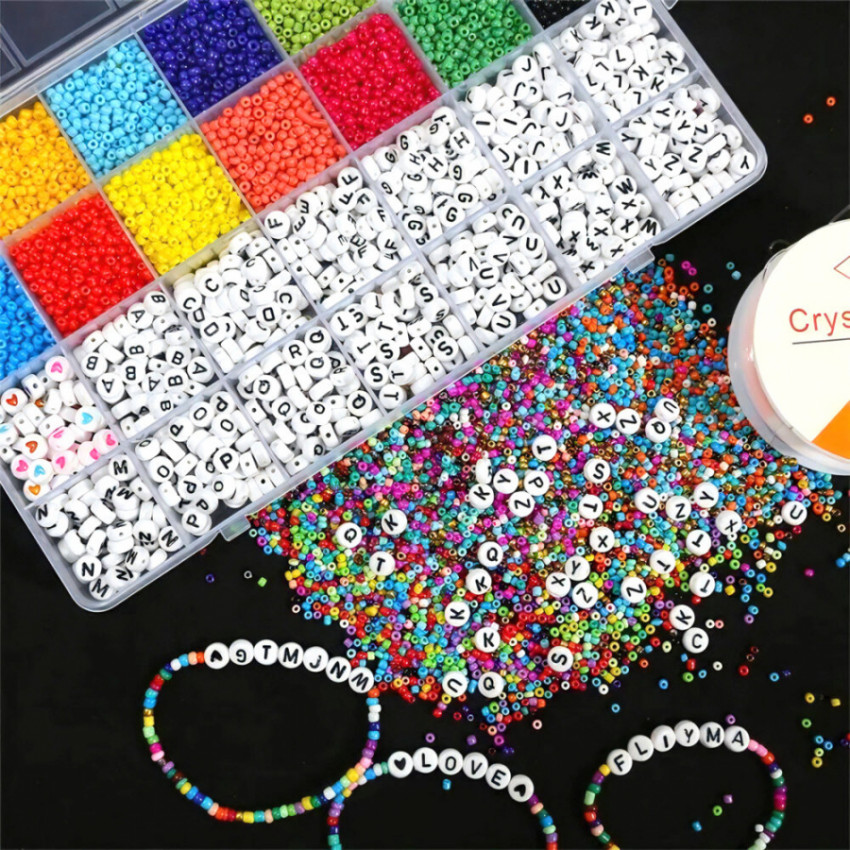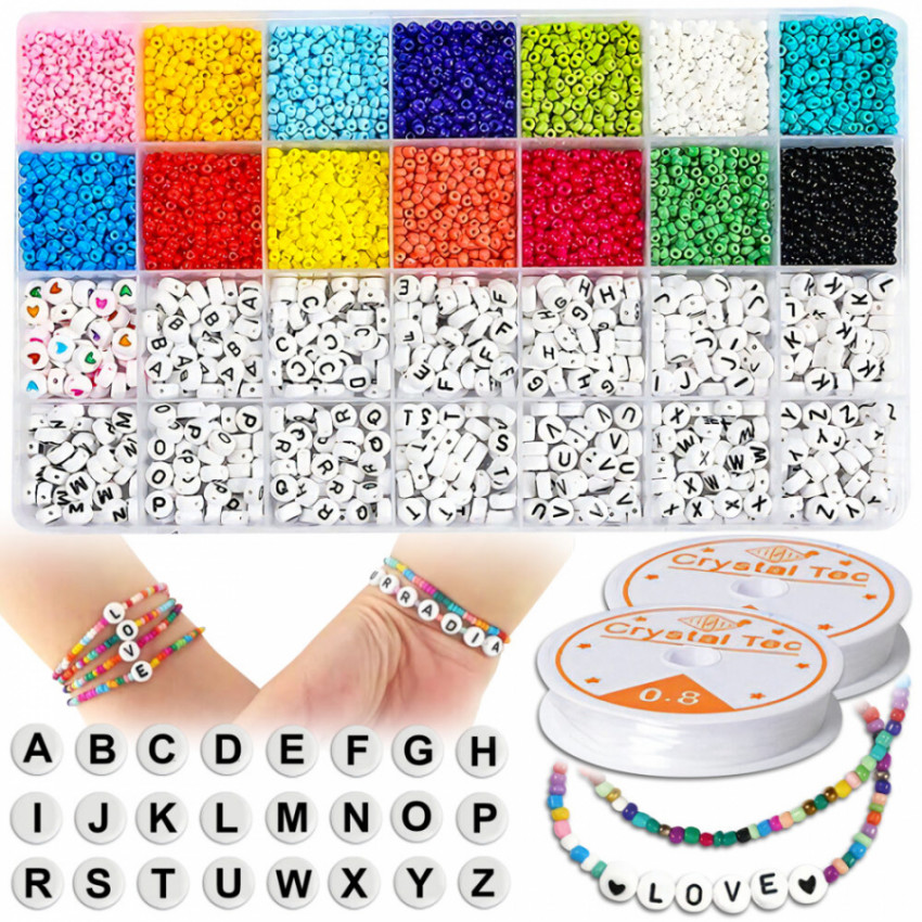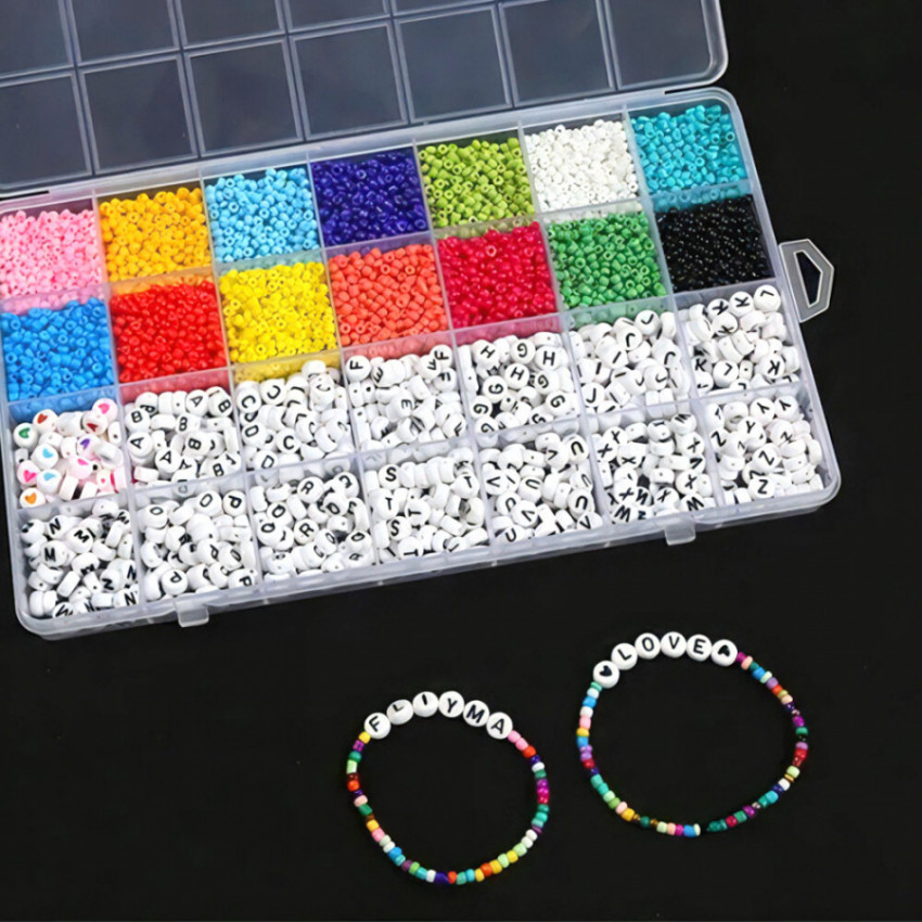 Balení obsahuje 4 475 ks korálků ve 14 barvách, 2 cívky rybářského vlasce a puzdro s přihrádkami.