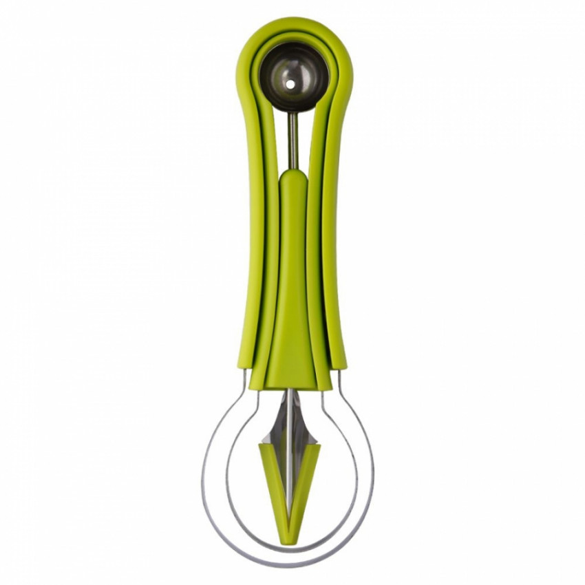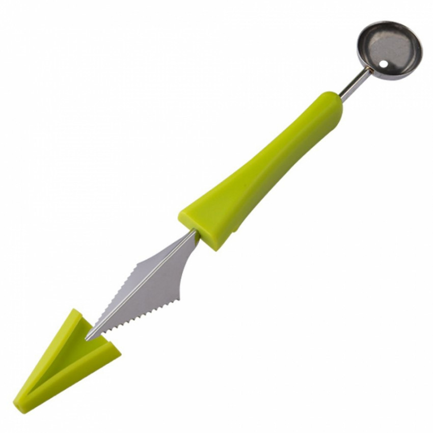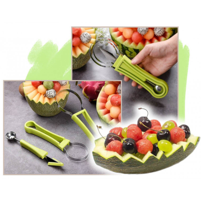 Jedinečný design zahrnuje melounový kráječ na vydlabávání, řezací nůž ve tvaru V na vyřezávání ovoce, naběračku na velké a malé ovoce na krájení ovoce a oddělování ovocné dužiny. Tento kráječ je šikovná kuchyňská pomůcka na ovocné saláty, ozdoby a zdravé ovocné občerstvení. Rozměry kráječe jsou 21 x 6 cm.
