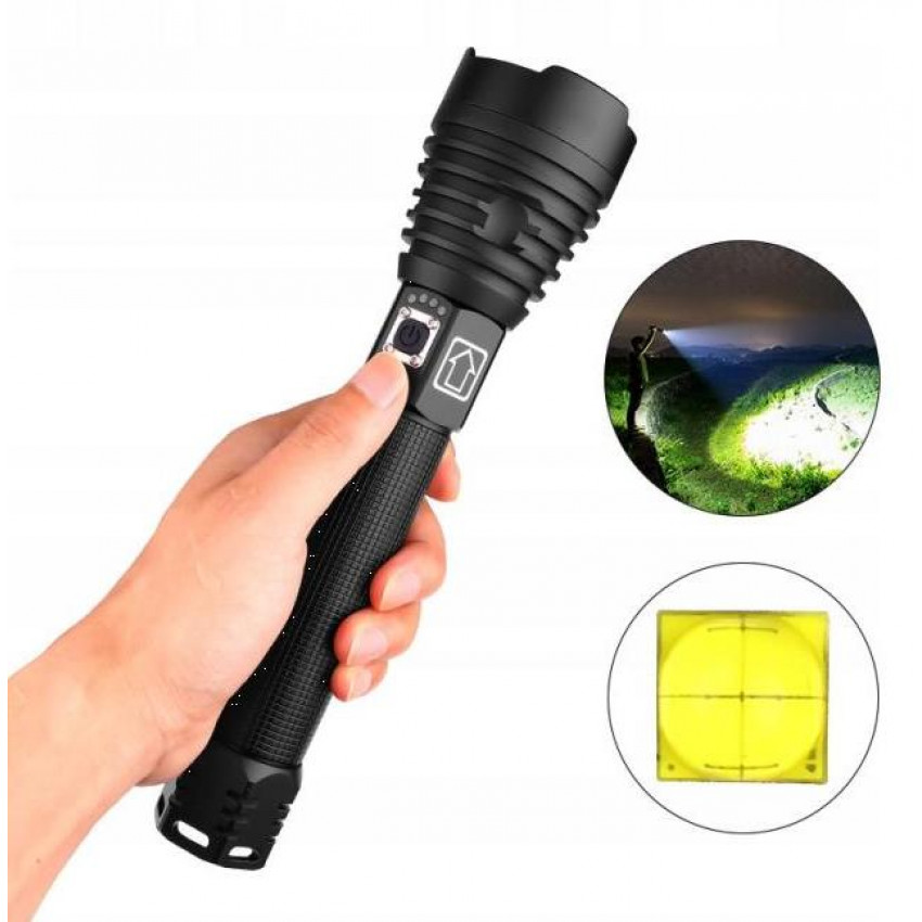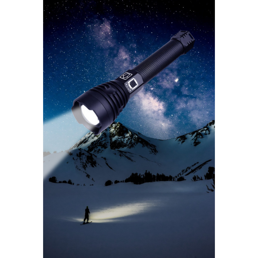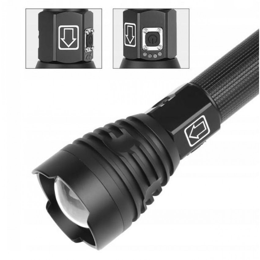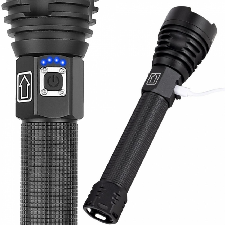 Naše baterka má indikátor nabití v podobě 4 modrých LED diod nad vypínačem, takže vždy víte, v jakém stavu se baterka nachází. Baterka je vybavena prodlouženým hřídelem se čočkou, která umožňuje nastavení šířky světelného paprsku. Díky tomu si uživatel může přizpůsobit jas světla podle svých potřeb.