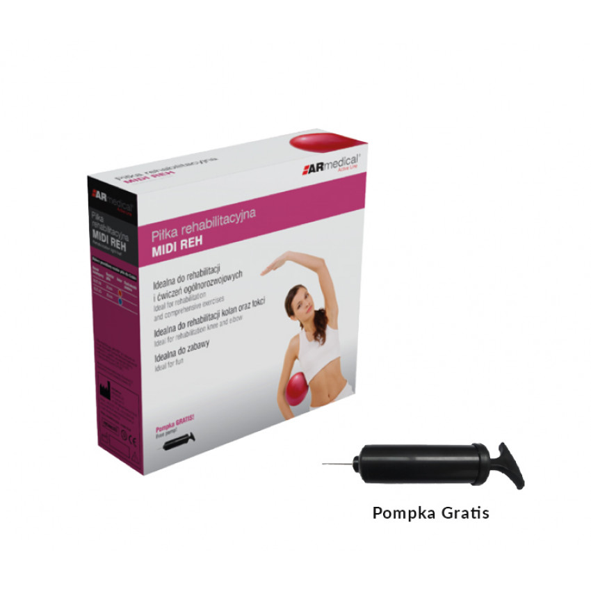 Rehabilitační míč MIDI REH je určen pro terapii na zlepšení fyzického stavu a koordinace pohybů, na izometrická cvičení, která působí proti svalové atrofii, na udržení svalové aktivity imobilizovaných částí těla (při úrazech a zlomeninách) a na obnovu svalů, růst a sílu.