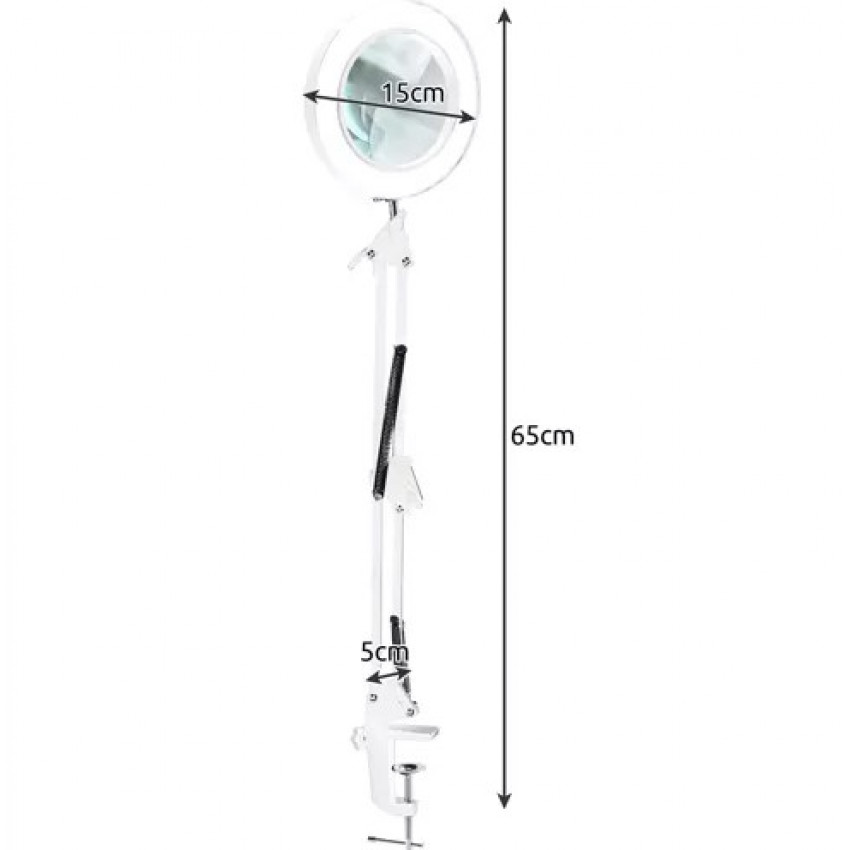 Tato multifunkční lampa s lupou se vyznačuje lehkou a kompaktní konstrukcí, která umožňuje snadné připevnění na desku, okraj kosmetického stolu nebo skříňky pomocí pevného kovového držáku, který je součástí balení. Upínací svorka s polohovací šroubem zajistí stabilitu. Odolné pružiny namontované na kloubech umožňují snadné manévrování. Kvalitní motýlkové šrouby zajistí stabilizaci ve zvolené poloze. Bílá barva dodává eleganci a sofistikovanost.