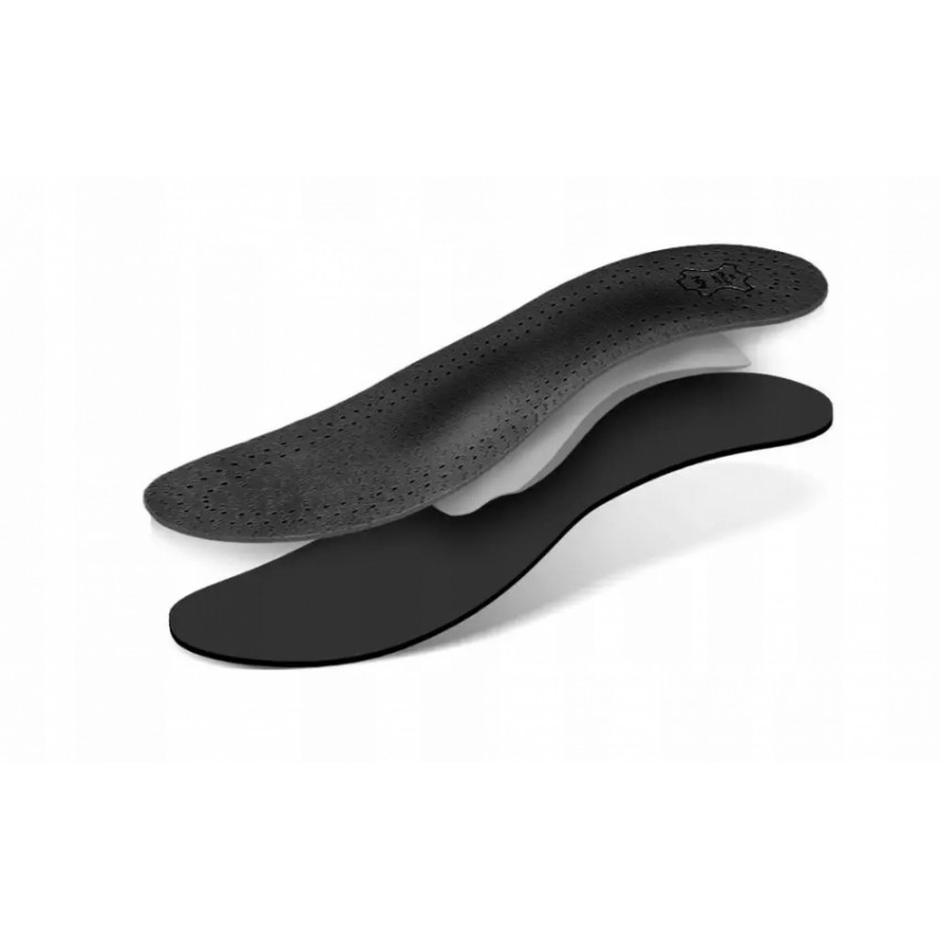 Kožené ortopedické pohodlné stélky do obuvi pro lidi s bolestí spojenou se sníženou příčnou a podélnou klenbou. Jsou vyrobeny z přírodní rostlinně vyléčené černé kůže a vrstvy latexové pěny s aktivním uhlím. Přírodní černá kůže snadno absorbuje pot vylučovaný chodidlem a aktivní uhlí neutralizuje nepříjemný zápach, díky čemuž je obuv čistá a hygienická po dlouhou dobu. Mezi materiály je přilepený měkký profilovaný prvek z latexové pěny. Profilovaný prvek se skládá z podpory metatarzální a podélné klenby, současně příznivě mění rozložení tlaku na chodidle. Jsou vhodné do všech druhů obuvi.