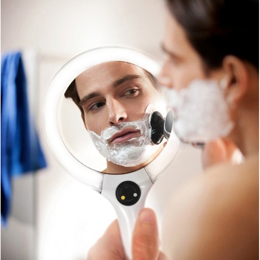 Další výhodou tohoto zrcadla je to, že je oboustranné a dá se natočit do libovolného úhlu. Zatímco na jedné straně Vám poslouží klasické zrcadlo s reálným zobrazením, na straně druhé najdete zrcadlo, které zvětšuje obraz 5x.