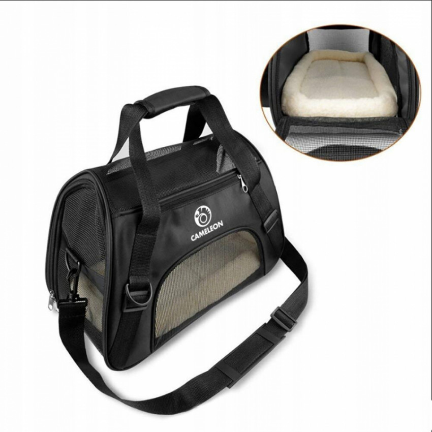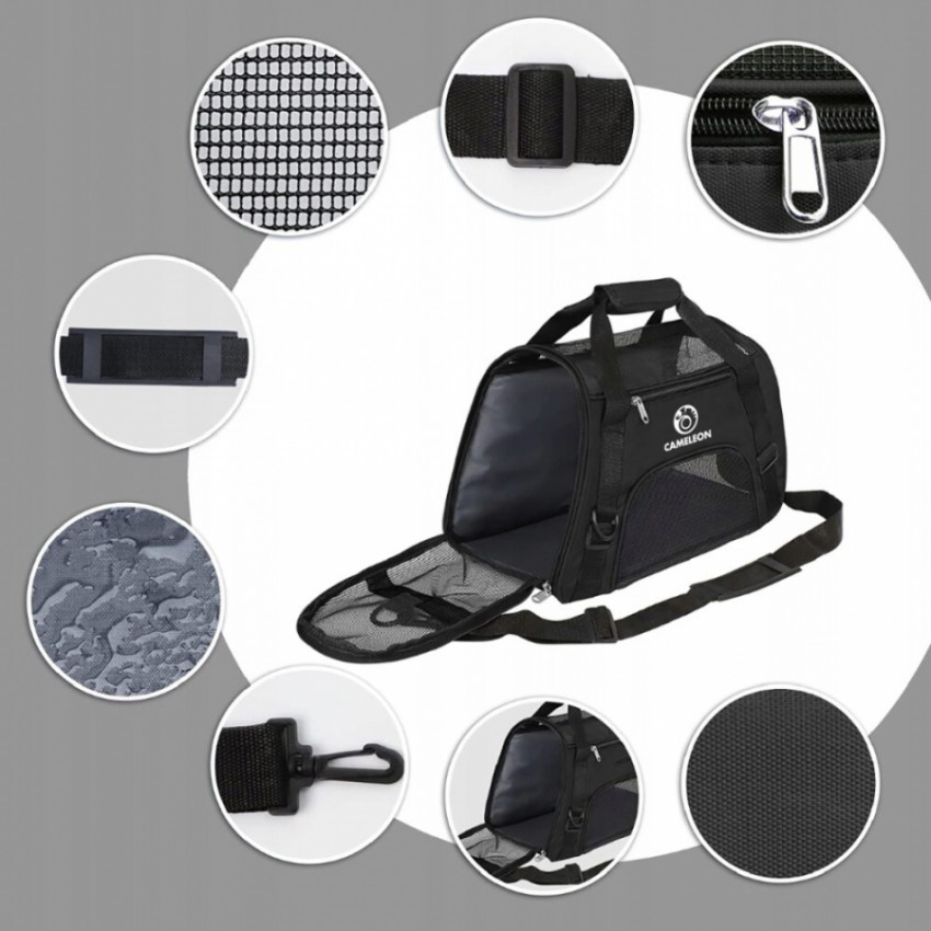 Taška na přepravu zvířat je vyrobena z odolných materiálů, takže odolá zátěži až 10 kg. Nylonový materiál, ze kterého jsou vyrobeny stěny tašky, je voděodolný, síťovina, z níž jsou vyrobeny boční klopy, je odolná a neroztrhne se ani nerozkouše. Pohodlné boční otvory umožní zvířeti volný vstup a výstup z tašky a další kapsa na zip v horní části vám umožní uložit drobnosti, jako jsou pamlsky, zdravotní knížka nebo pas.