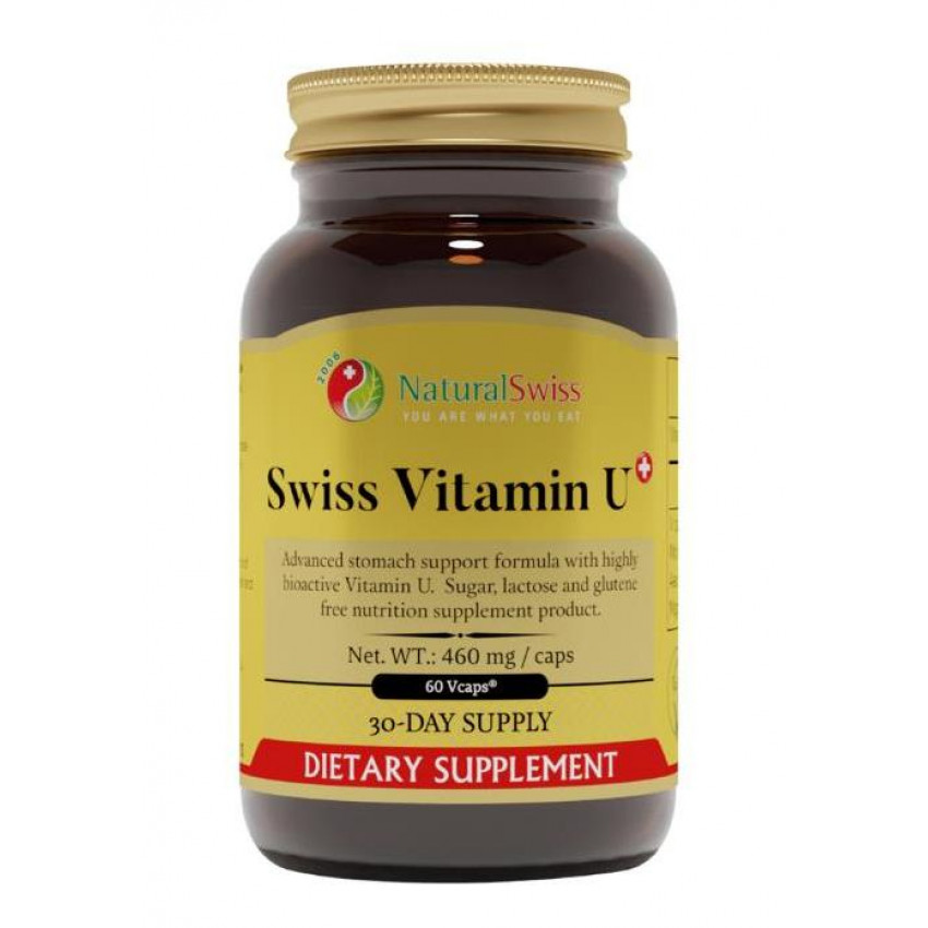 Vitamín U je derivát aminokyseliny s gastroprotektivními vlastnostmi (ochrana žaludku). 100% přírodní složky přípravku Swiss Vitamin U s vysokým obsahem účinných látek účinně podporují zdraví a regeneraci střevní sliznice, jakož i urychlují hojení vředů trávicího systému.