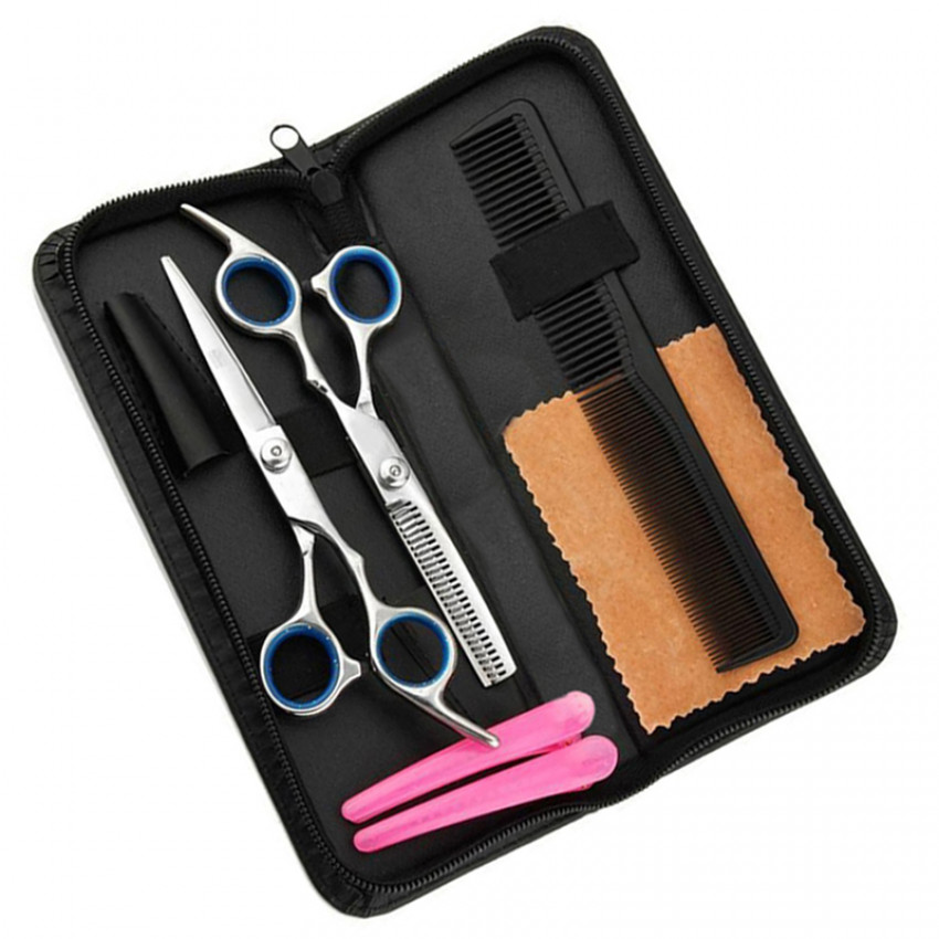 Profesionální kadeřnická sada se skládá ze dvou ergonomických nerezových nůžek (klasické a efilační nůžky). Jsou ideální pro profesionální použití, ale i amatérské stříhání vlasů. Čepel nůžek má speciální šroub pro nastavení síly sevření. Gumové zarážky mezi úchopy prstů zajišťují tichý chod. Dodatečné opěrky prstů zvyšují přesnost střihu a snižují únavu rukou. Sada obsahuje také pevný hřeben na rozčesávání vlasů, dvě sponky navíc a hadřík.