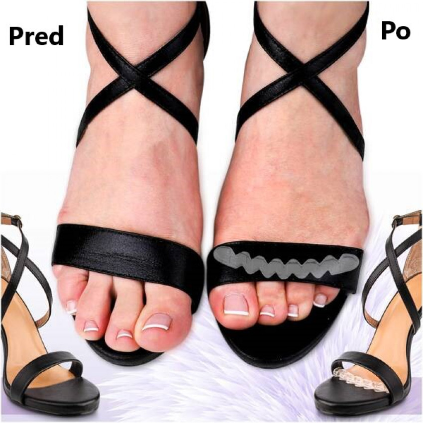Spodní strana vložek je pokryta lepidlem, stačí odtrhnout ochrannou fólii a umístit ji do přední části boty na místo, kde prsty vycházejí z chodidla. Nalepení vložek na tomto místě na podrážce zajistí, že chodidlo se o tyto měkké vložky opírá a nebude se klouzat dále k špičce boty.