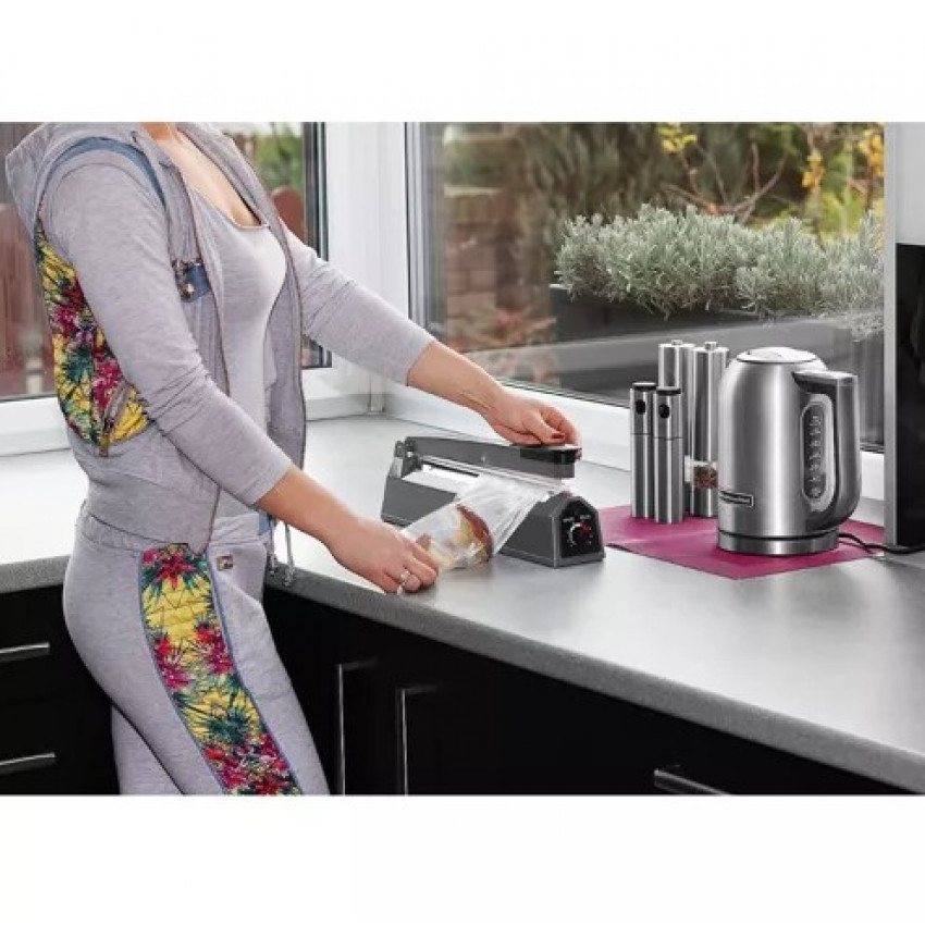 Použití svářečky umožňuje hermetické uzavření obalů, což je důležité pro zachování čerstvosti potravin, ochranu před vlhkostí, pachy a ochranu před vzduchem a kontaminací. Zařízení má výkon 400 W, což zaručuje pevný a odolný svár široký 2 mm a dlouhý až 300 mm. Stačí nastavit čas svařování pomocí knoflíku (1-8 sekund), vložit fólii do čelistí svářečky a stlačením ramena fólii slepit.