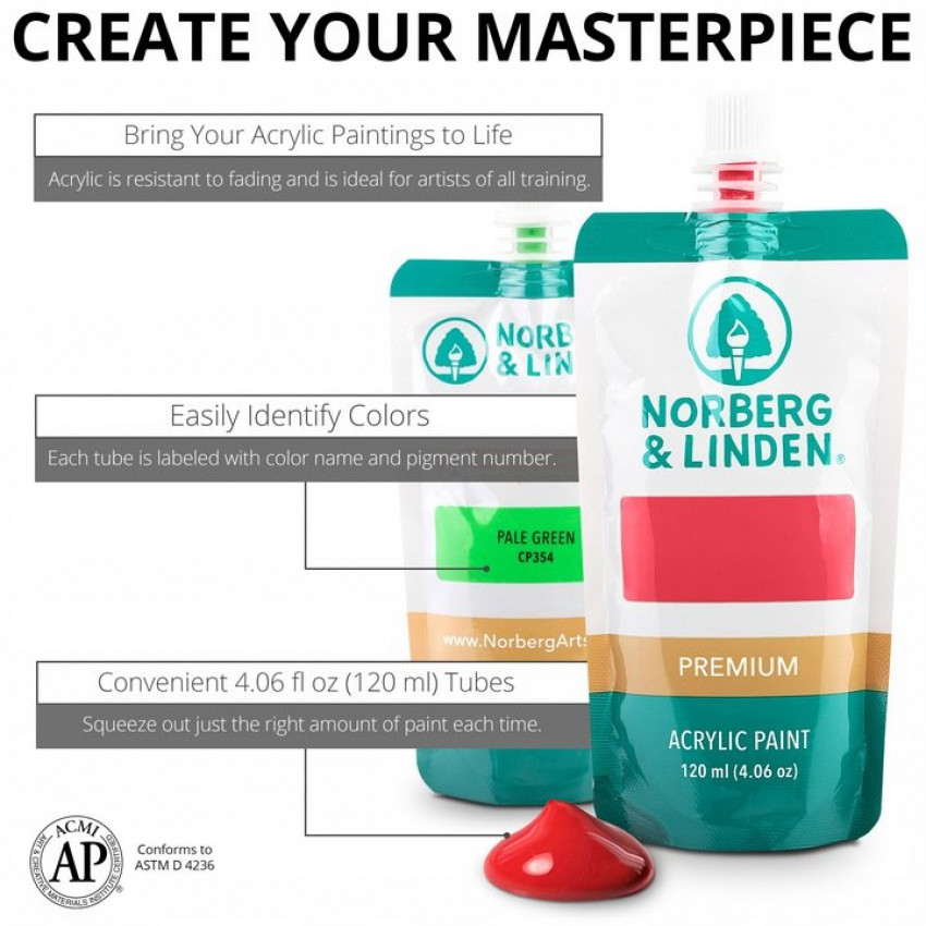 Profesionální set patnácti zásobníků 120 ml vysoce kvalitní akrylové barvy, pro dospělé a děti, začátečníky a profesionály. Jemná, snadno mísitelná akrylová barva, vysoce adaptabilní na míchání nekonečných barevných kombinací. Můžete také experimentovat s použitím štětců a paletových nožů a vytvářet textury.