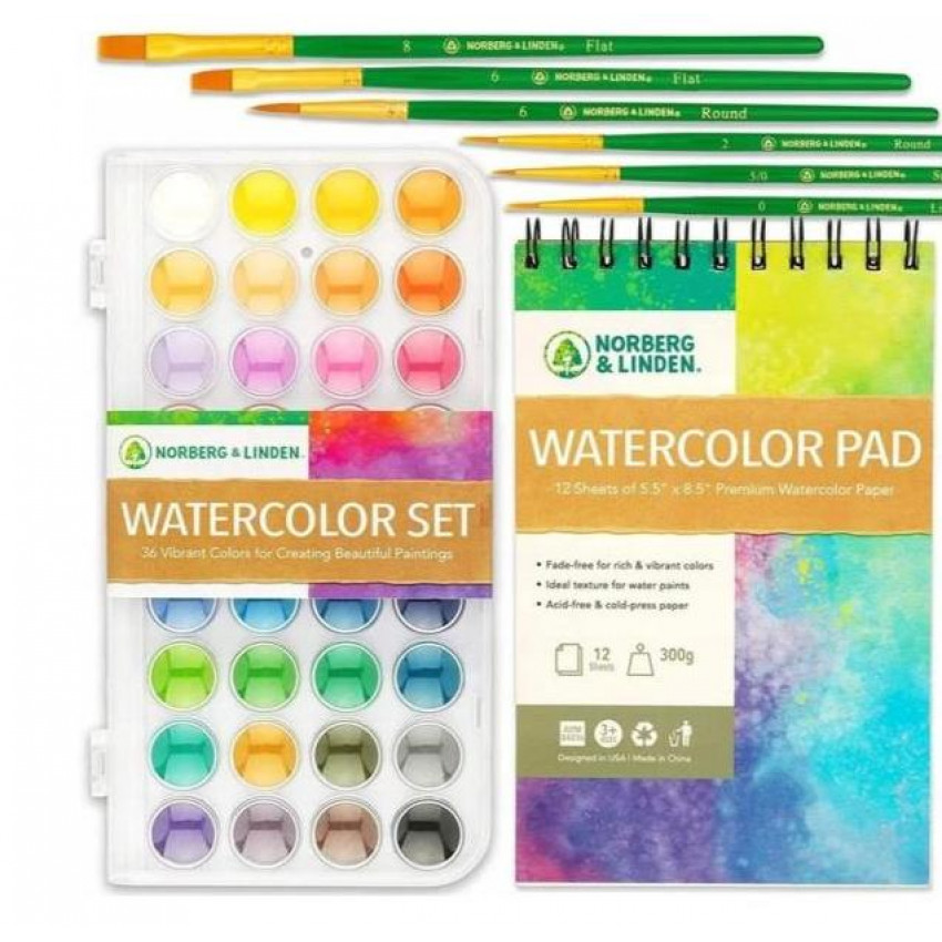 Ideální pro začátečníky i profesionální výtvarníky, tato sada nabízí perfektní start do světa akvarelového malování. Obsahuje 36 zářivých akvarelových barev, 6 různých štětců a 12stránkový blok profesionálního akvarelového papíru s gramáží 300g.