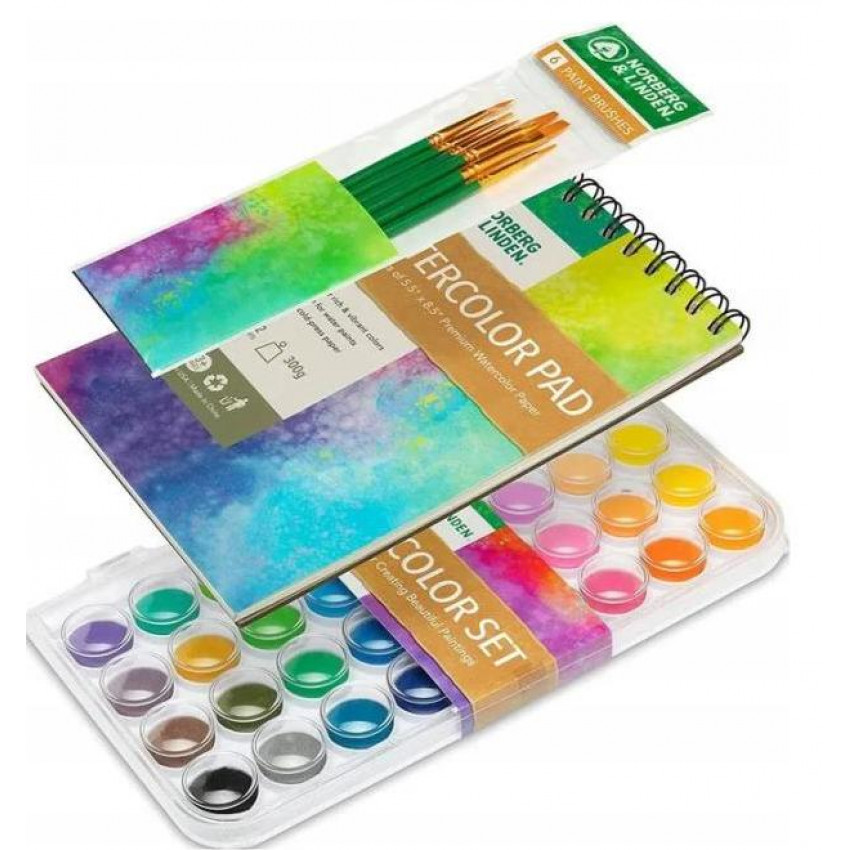 Perfektní prémiová startovací sada na akvarelové malování. Sada na snadné malování akvarelovými barvami pro začátečníky až po profesionální výtvarníky. Sada s 12 stránkovým blokem akvarelového papíru 300g, profesionálním papírem připraveným k akci.