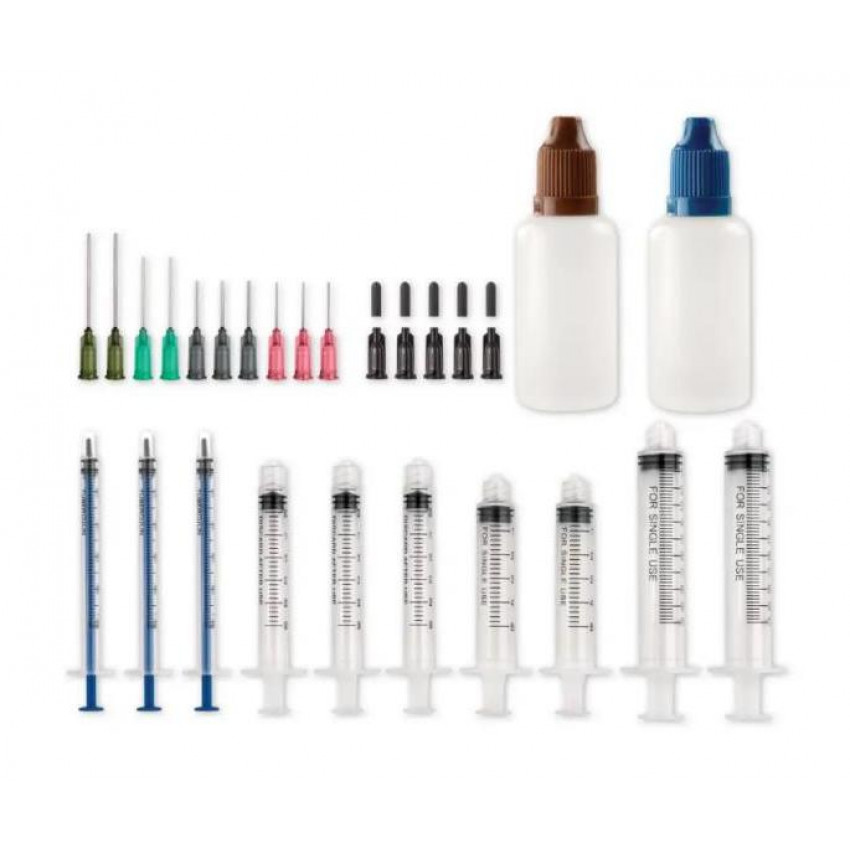 Široké využití od éterických olejů, hobby produktů, tmelů, až po přesné průmyslové aplikace. Sada obsahuje aplikátory pro plnění a měření kapalin, lepidla, oleje nebo lepidla, výrobu šperků a elektronických součástek.