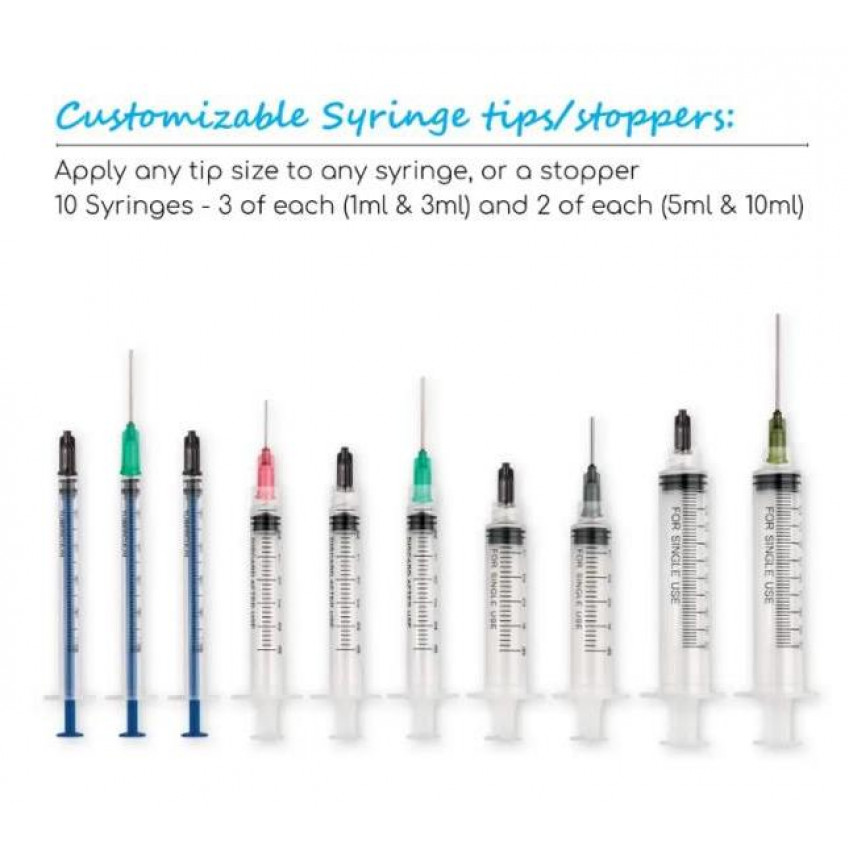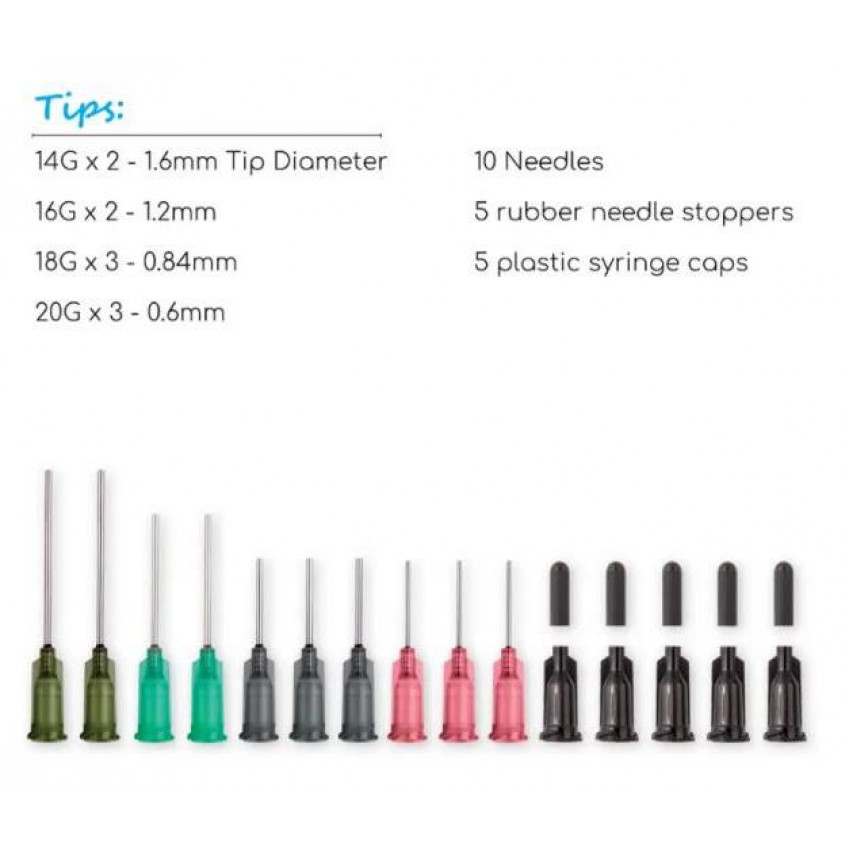 Sada injekčních stříkaček s tupými jehlami a lahvičkami na zdobení. Široká škála aplikací aplikátorů pro použití na éterické oleje, hobby produkty, tmely, přesné průmyslové aplikace, plnící a měřicí kapaliny, lepidla, aplikátory olejů nebo lepidel, výroba šperků, elektronické součástky.