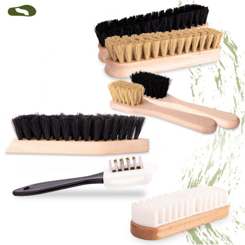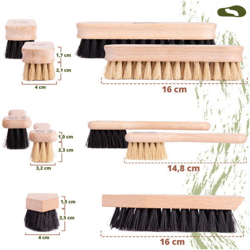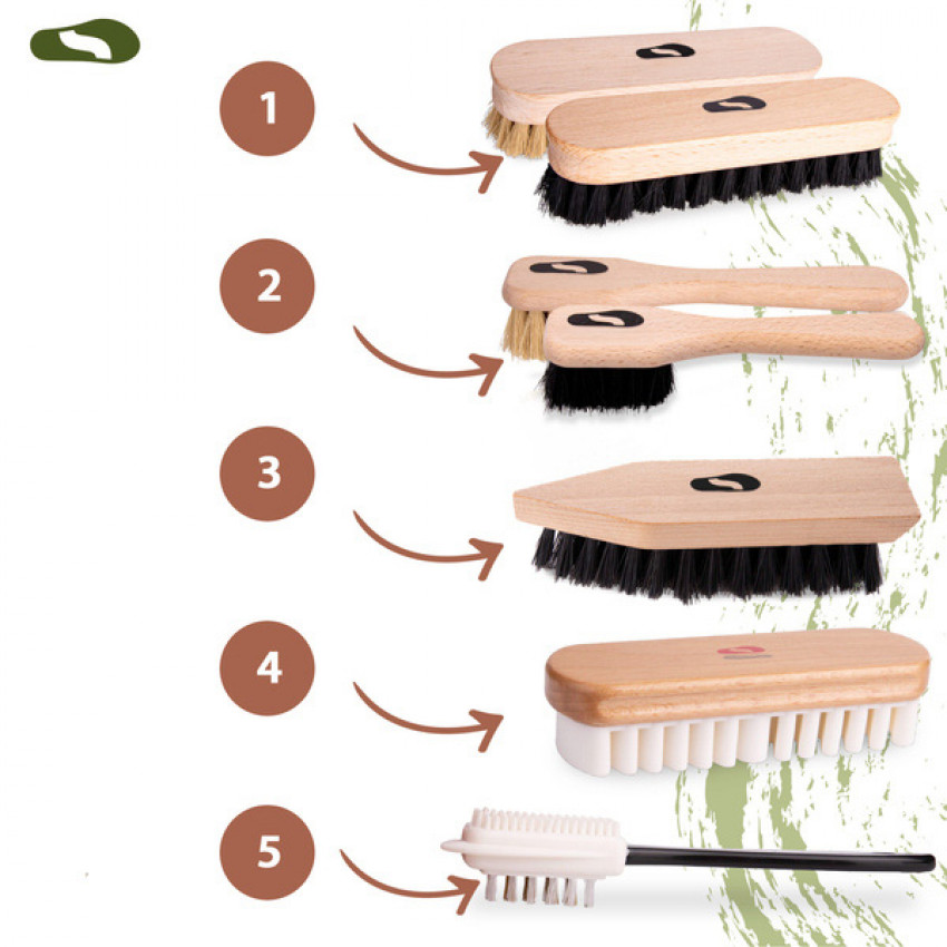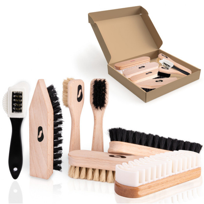 Udržujte svou obuv v bezchybném stavu s touto luxusní sadou, která zaručuje komplexní čištění a údržbu. Ergonomická rukojeť z bukového dřeva a vysoce kvalitní plast a guma zajišťují dlouhou životnost kartáčů.