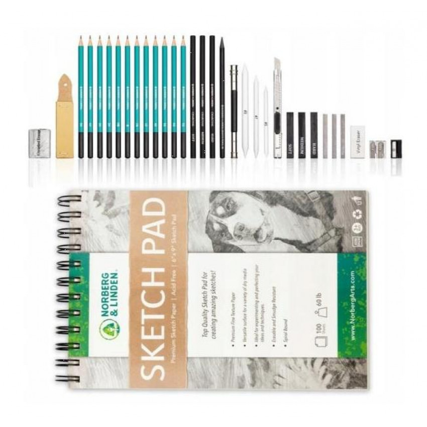 Profesionální sada na kreslení pro nováčky nebo zkušené skicáře. Začněte kreslit hned, jak otevřete balík. Sada se 100 stránkovým skicářem střední gramáže, profesionálním skicářským papírem bez skvrn, připraveným na akci. Sada obsahuje přesně a předem nabroušené tužky s protiskluzovou úpravou a profesionální cestovní úložný obal.