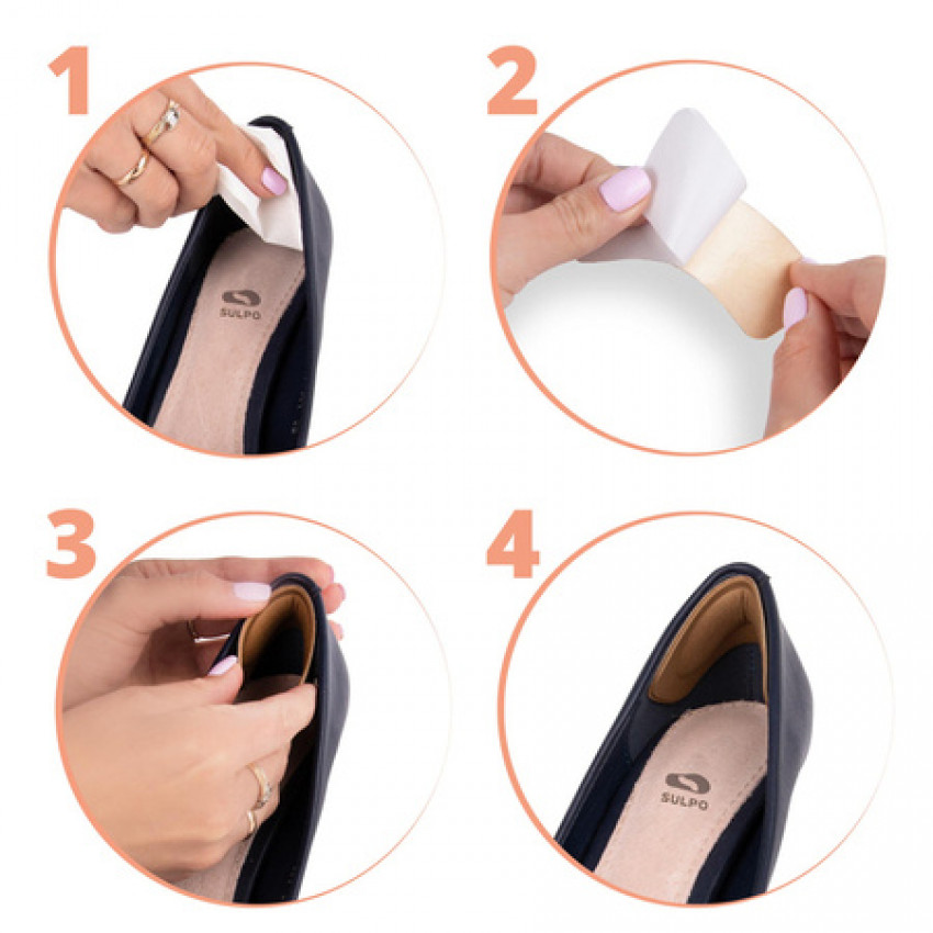 Postup je jednoduchý. Nejprve očistěte vnitřek boty, odstraňte ochrannou fólii a umístěte patní pult do zadní části obuvi. Poté přitlačte a počkejte několik minut, než lepidlo začne působit.