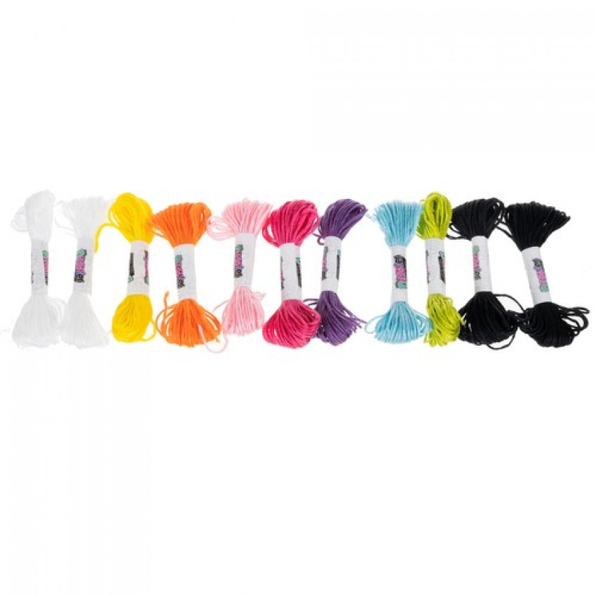 Sada obsahuje nitě v 9 barvách, včetně bílé, černé, růžové, fialové, modré, žluté, oranžové, pastelově růžové a zelené. Děti mohou kombinovat barvy podle vlastního vkusu a vytvářet tak náramky plné barev a originality.
