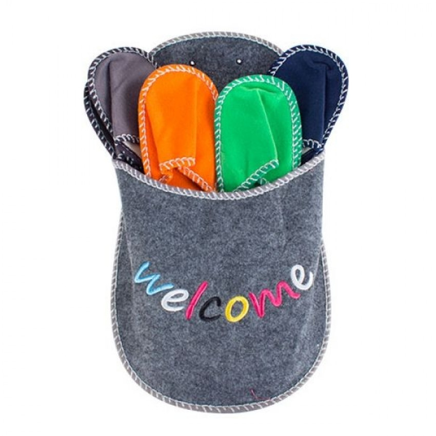 Přidejte do svého vstupního prostoru jedinečný a originální prvek, který poskytne pohodlí vašim hostům hned při vstupu. Sada obsahuje 4 páry pantoflí ve vybraných barvách a jednu extra velkou pantofli, která slouží jako kapsa na menší pantofle.