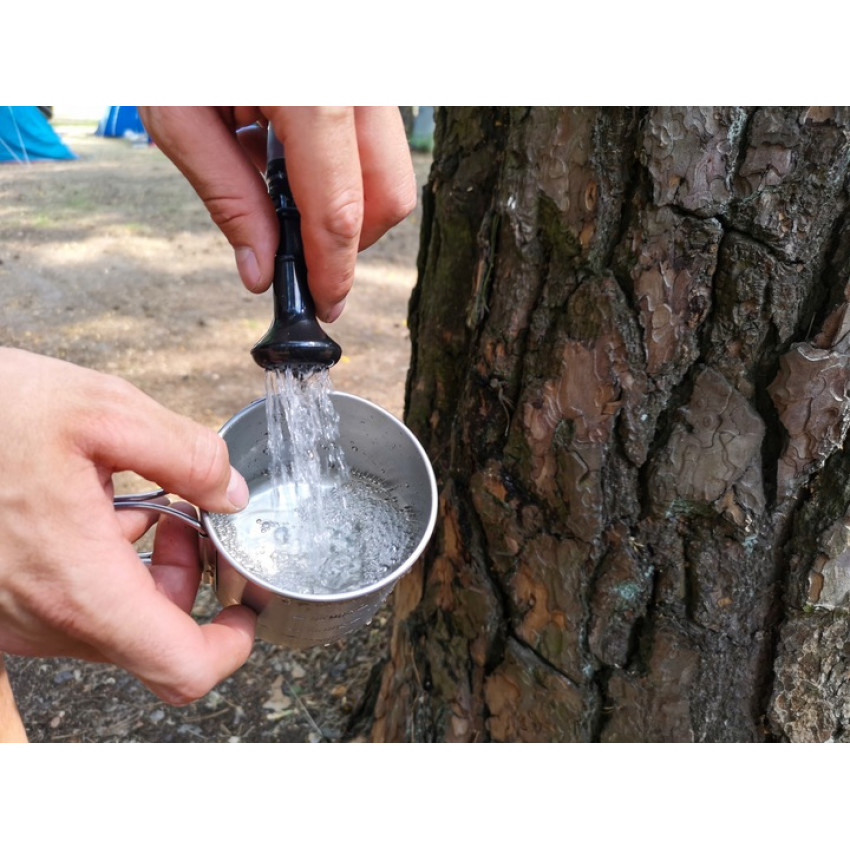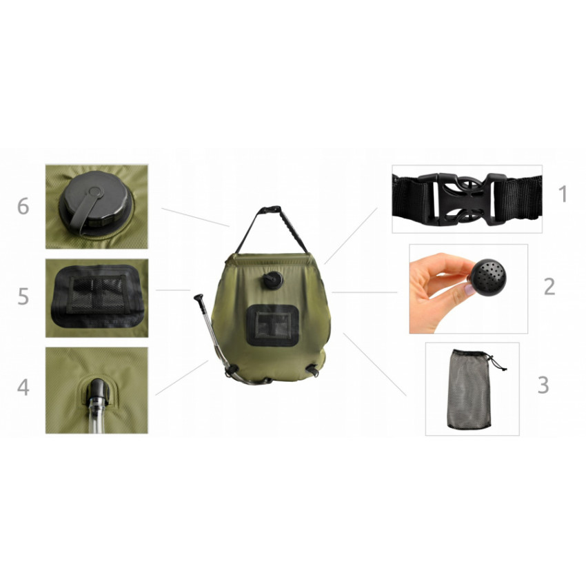 Sprcha má dvojité vrecko, které vám umožní ukládat malé předměty potřebné na koupání, např. šampón, gel. Pokud chceme, aby byl kohoutek nahoře, jednoduše ho zavěste. Vodovodní kohoutek má sprchovou špičku 40 centimetrů, kterou stačí vytáhnout, aby mohla voda protékat a po použití stačí zavřít přívod vody. V horní části je také gumová rukojeť pro pohodlné přenášení, jakož i zavěšení, na obou stranách v dolní části jsou také dvě rukojeti, díky nimž zajistíme pevnější zavěšení, například na strom.
