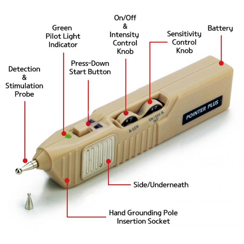 Použití Pointer Plus je jednoduché. Zařízení obsahuje sondu s pružinovým aktivátorem, která poskytuje vizuální a zvukové upozornění při stisknutí bodu na pokožce. Když najdete akupunkturní bod, můžete přepnout zařízení do režimu stimulace. Úroveň stimulace můžete nastavit pomocí dvou samostatných otočných ovladačů. Po nalezení tlakového bodu začne elektroakupunktura stimulovat svaly pacienta pomocí neinvazivních elektrických signálů. Zařízení je napájeno baterií a nabízí nepřetržitou stimulaci mezi 0 až 50 miliampéry, čímž zajišťuje úlevu od bolesti bez použití jehel.