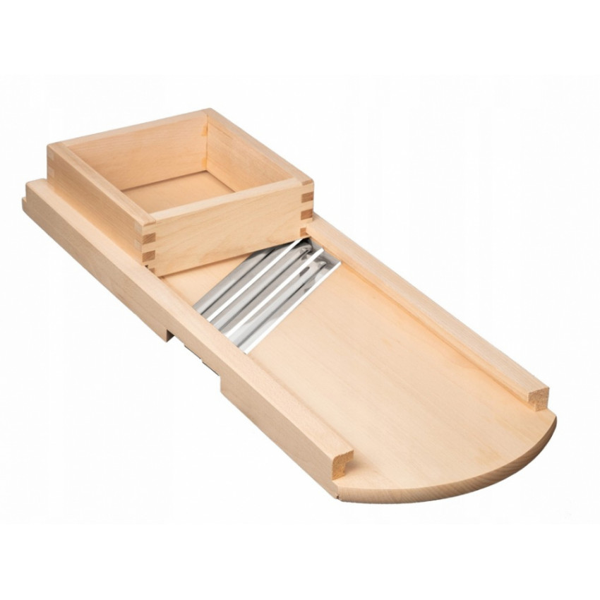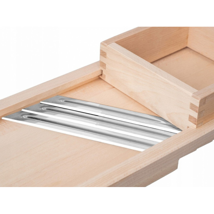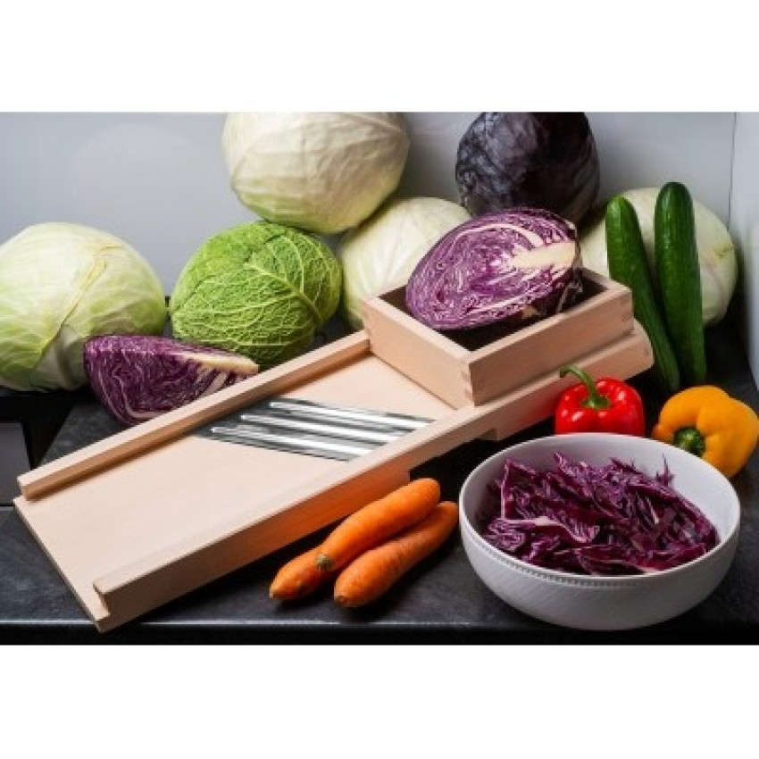 Ručně vyrobené struhadlo s třemi ostrými čepelemi z dřeva a kovu pro rychlé a rovnoměrné strouhání zelí a zeleniny. Všestranné a odolné, ideální do každé kuchyně. Snadná údržba, doporučuje se ruční mytí.