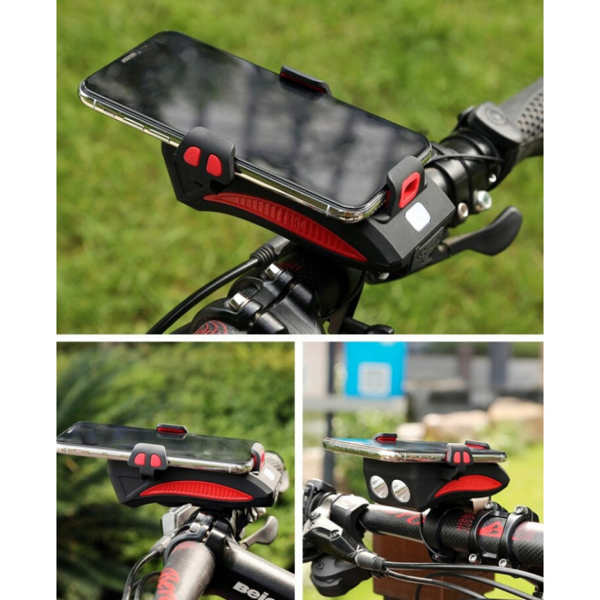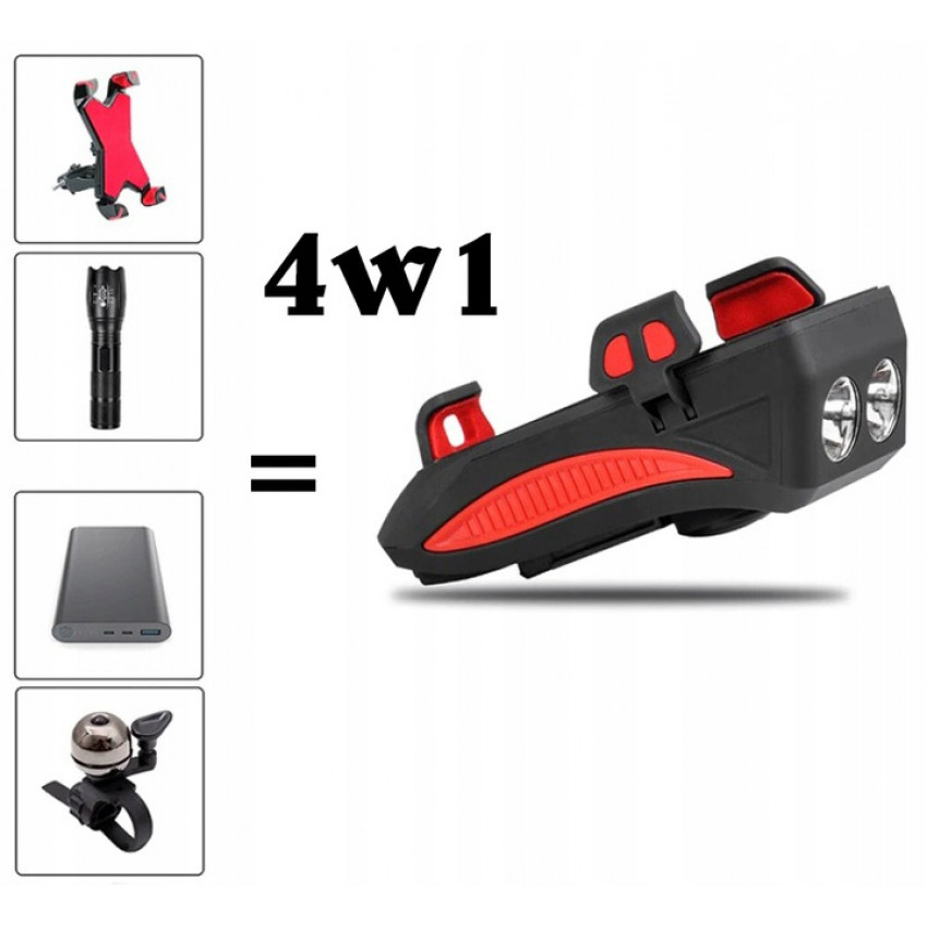 Světlo na kolo 4 v 1 s klaksonem, držákem na telefon a power bankou