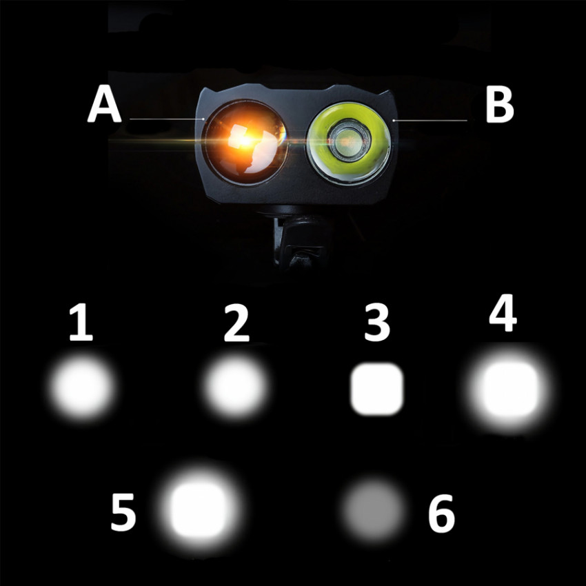Světlo je vybaveno dvěma efektivními T6 LED diodami s různými charakteristikami. Díky použití dvou typů čoček vyzařuje jedna dioda rozptýlené (A) a druhá zaostřené (B) světlo. Díky tomu má zařízení až 6 režimů svícení, díky kterým můžete osvětlení přizpůsobit jízdním podmínkám. Protože je lampa snadno rozebíratelná, lze ji použít i jako baterku. Prostorná baterie zaručuje až 20 hodin nepřetržitého provozu. Zabudovaný soumrakový senzor vám umožní ušetřit energii přizpůsobením jasu světla převládajícím podmínkám.