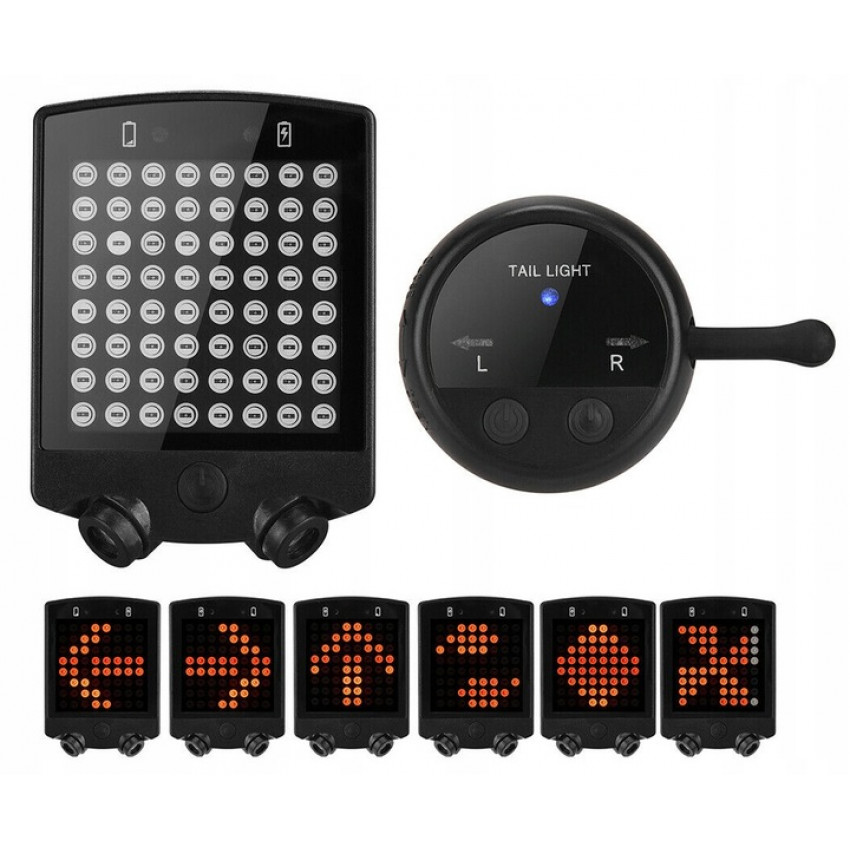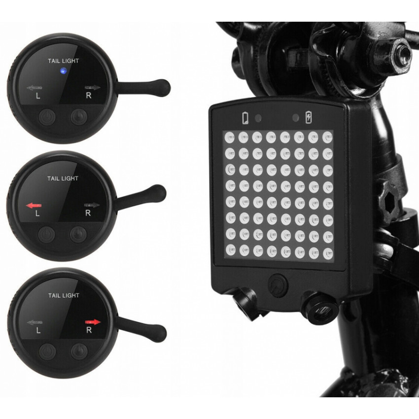 Zadní světlo na bicykl se směrovými světly a bezdrátovým dálkovým ovládáním. Dálkové ovládání, které můžete připevnit na řídítka, umožňuje přepínání mezi levým a pravým směrovým světlem. Světlo je napájeno nabíjecí 3,7V 650 mAh baterií, kterou lze nabíjet přes USB kabel.