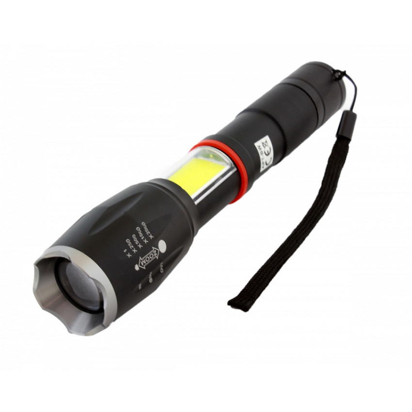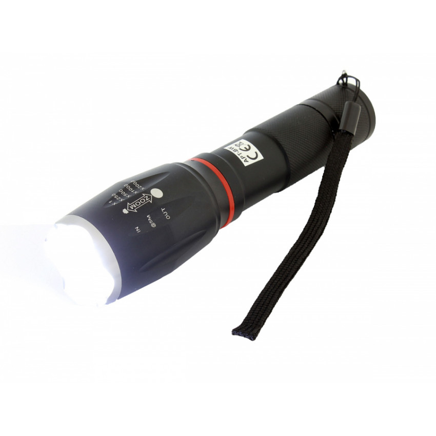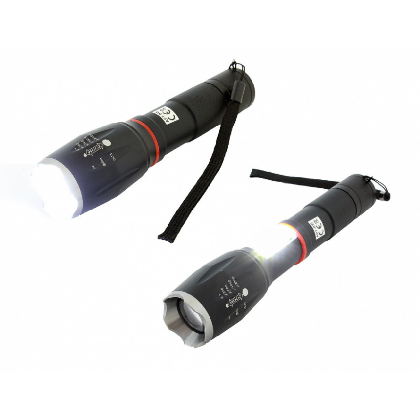Taktická svítilna s ultra silnou COB U3 LED diodou s funkcí ZOOM do 300m, ve velmi odolném obalu. Svítilna má velmi silný světelný zdroj se životností až 100 000 hodin. Pevná rukojeť zajišťuje bezpečné uchopení a pohodlné ovládání. Svítilna je také vodotěsná a nárazuvzdorná. Spínač je zajištěn pevnou gumou a aplikované těsnicí kroužky chrání přístroj před nečistotami a prachem.