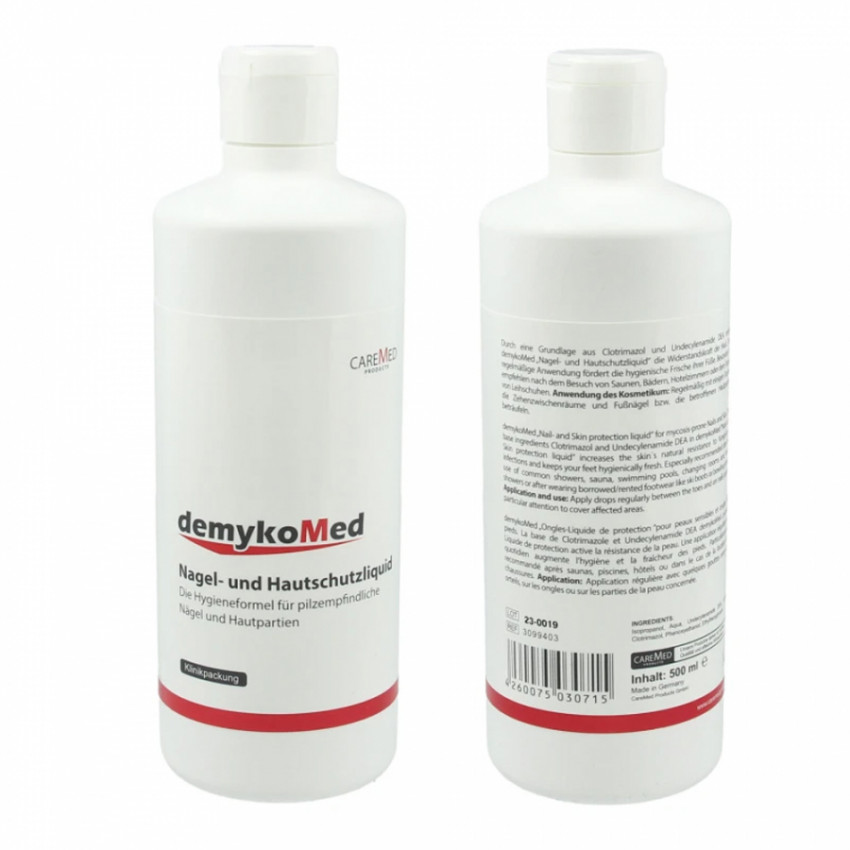 DemykoMed Nagel und Hautschutzliquid je speciálně vyvinutá tinktura na ochranu nehtů a pokožky proti mykóze, která poskytuje jedinečnou ochranu a prevenci před plísňovými infekcemi. Tento účinný přípravek obsahuje klotrimazol a undecylenamid DEA, složky známé pro své antimikrobiální vlastnosti, které pomáhají posílit odolnost nehtů a okolní kůže proti mykóze. Je ideální pro všechny, kteří často navštěvují riziková místa, jako jsou sauny, bazény či hotelové pokoje, nebo pro ty, kteří nosí neprodyšnou obuv, v níž je zvýšené riziko vzniku plísní.