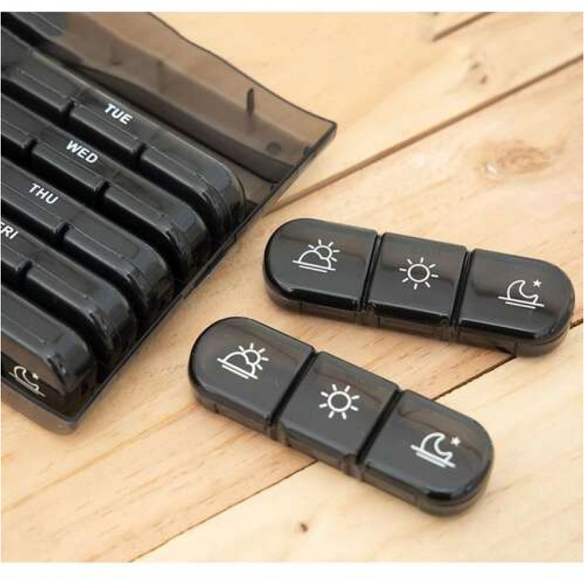 Každý ze sedmi kontejnerů v organizéru je rozdělen do tří samostatných komor, označených symboly, které označují denní dobu: ráno, poledne a večer. Každá přihrádka se zavírá samostatně na kliknutí, což zajišťuje bezpečné uložení léků a chrání je před vlhkostí a kontaminací. Přehledné značení pomáhá při rychlé a bezchybné přípravě vhodných dávek léků na jakoukoli denní dobu.