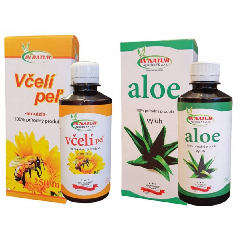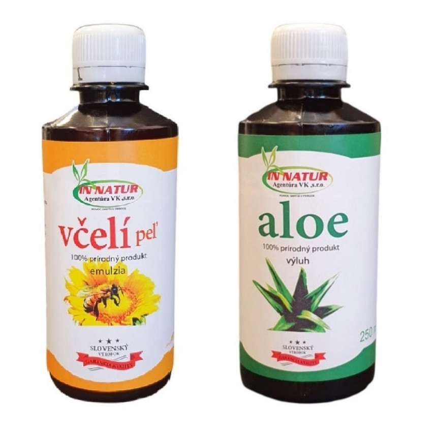 Balení obsahuje 1x 250ml láhev Aloe Vera výluhu a 1 x 250 ml Emulze včelího pylu.